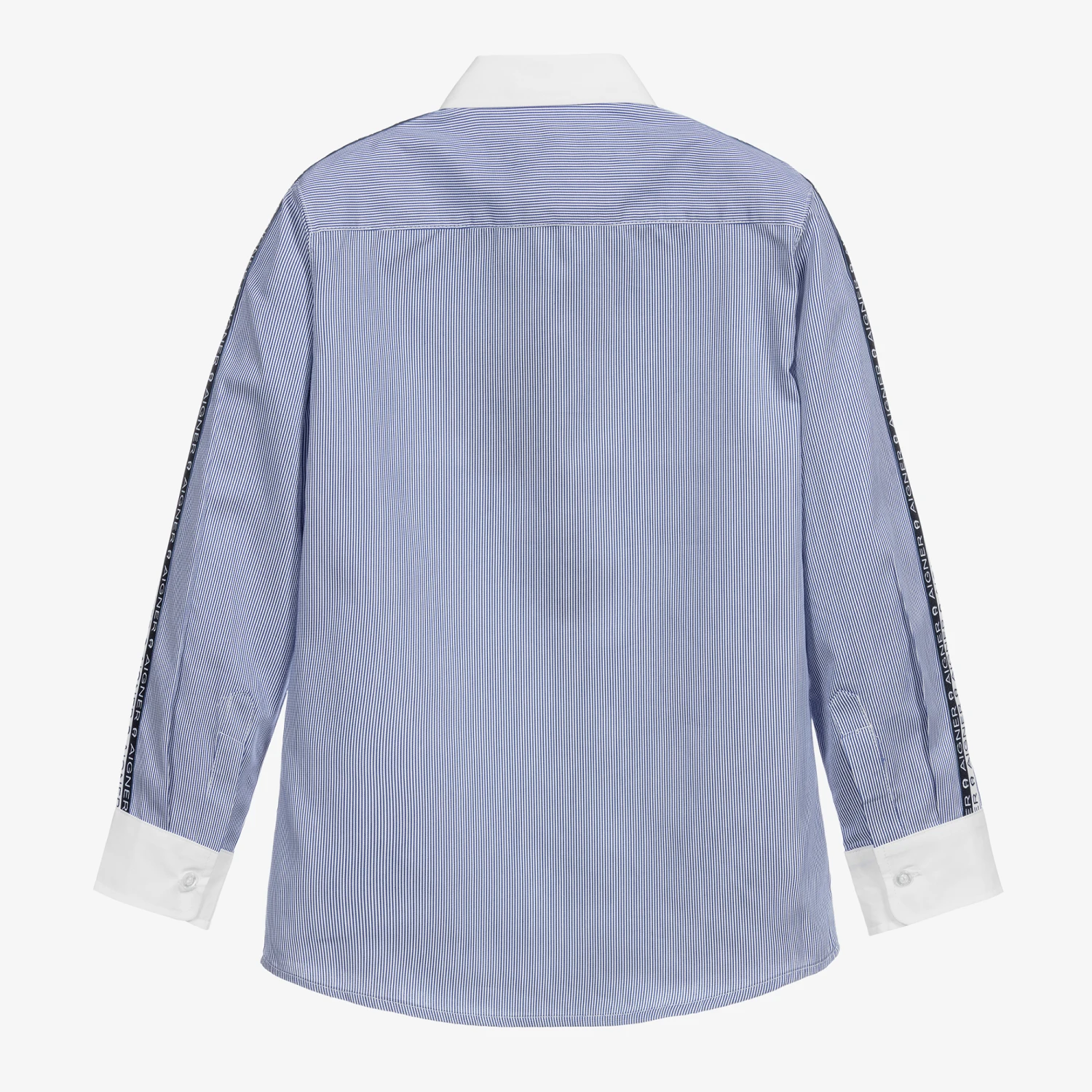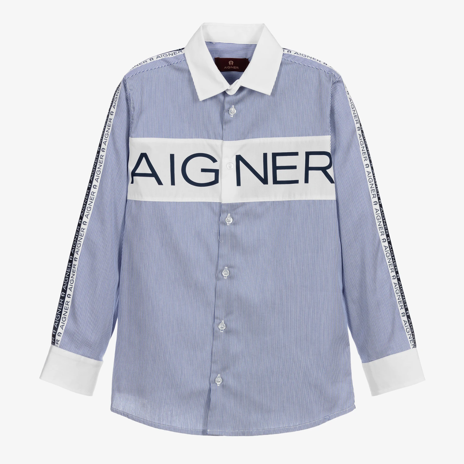 Teen boys navy blue and white striped shirt by AIGNER, made in lightweight cotton poplin. It has the designer’s name printed on the front and on tape along the sleeves.