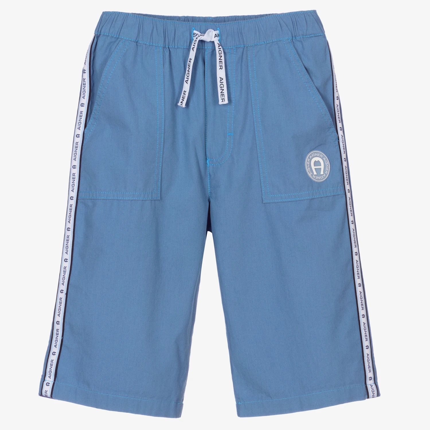 Blue Bermuda-style shorts for teen boys by AIGNER, made in soft, lightweight cotton twill. Trimmed with logo tape trims on the sides, they have a rubberised signature ‘A’ horseshoe logo on the front, and drawstring waistband for a comfortable fit.