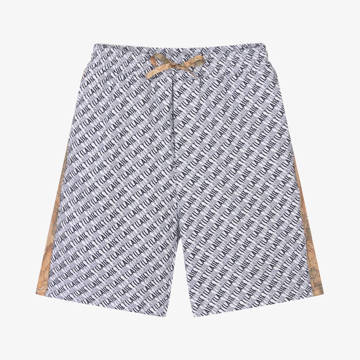 White shorts for teen boys by Italian label Alviero Martini, patterned with the brand’s 1a Classe logo in navy blue. Stylish yet comfortable, they are made in soft cotton jersey with an elasticated drawstring waistband and useful concealed side pockets. For a signature finish, they have dark beige Geo map print trim and drawstring tie.