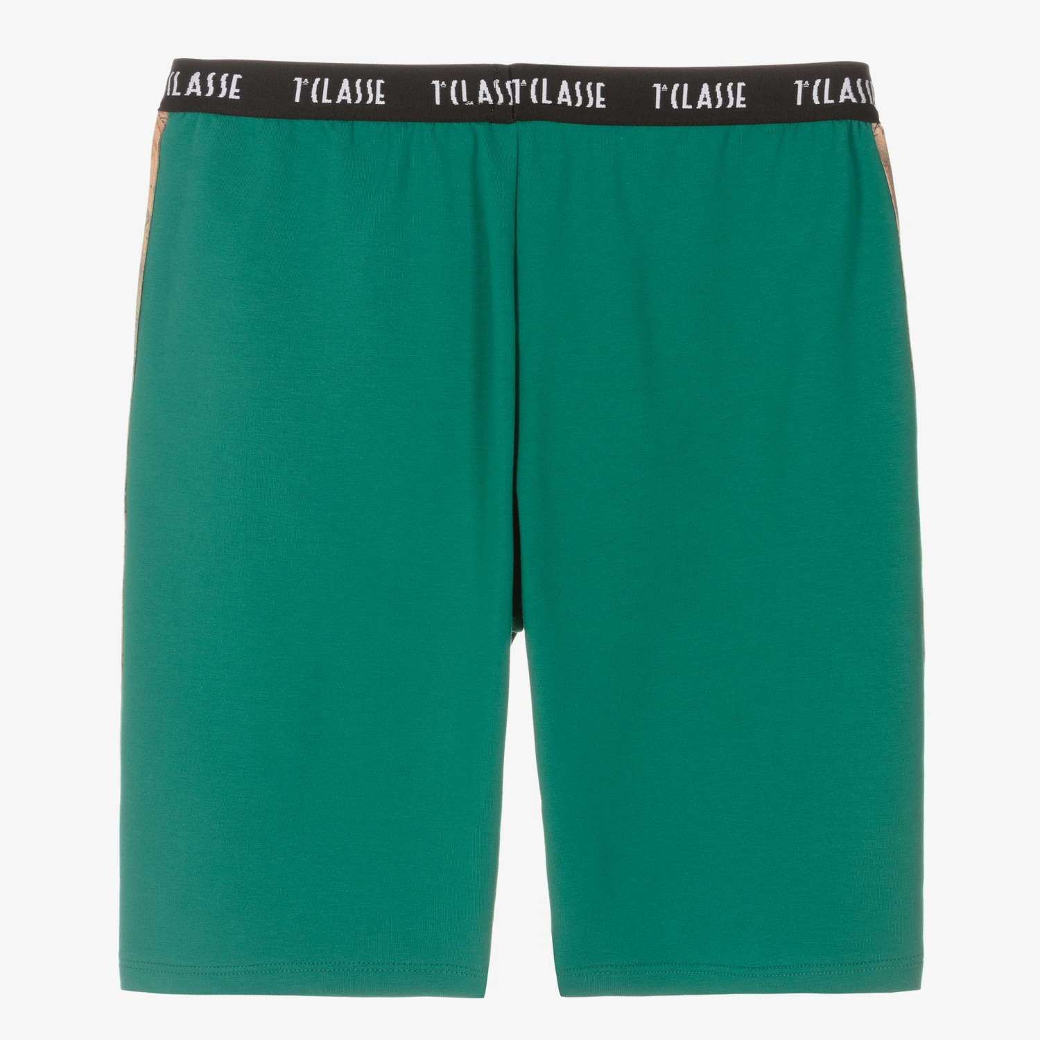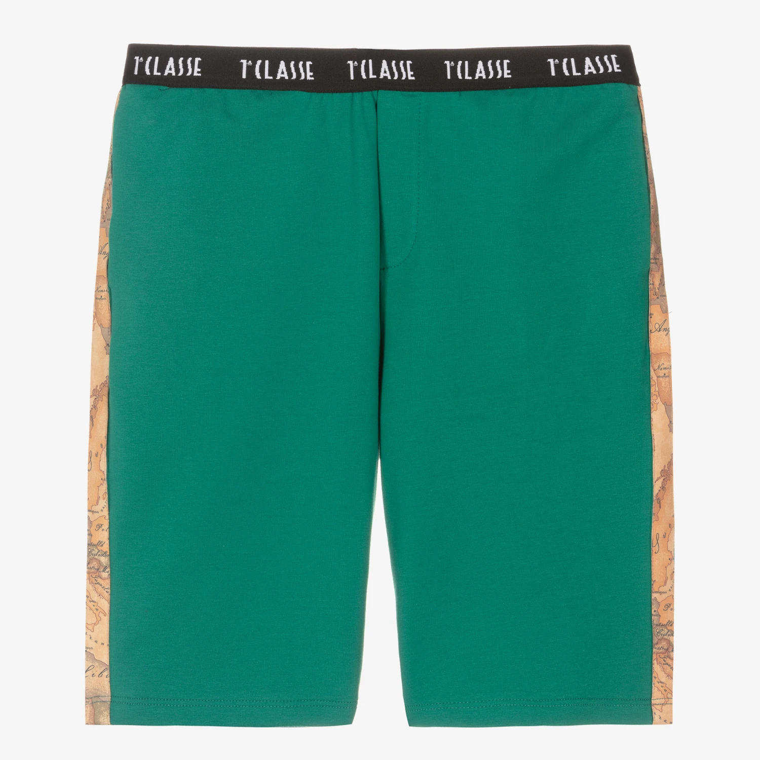 Forest green shorts for teen boys by Italian brand Alviero Martini, trimmed with the designer’s distinctive dark beige Geo map print. Designed with useful side seam pockets, the black elasticated waistband highlights the brand’s repeated 1a Classe logo for a signature look. These easy-to-wear shorts are made in soft cotton jersey for casual, comfortable style.