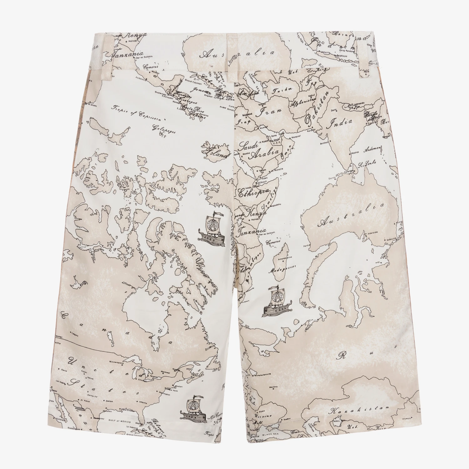 Ivory Bermuda-length shorts for teen boys by Alviero Martini, made in soft sateen cotton. Patterned with the brand’s signature Geo map print in beige and black, these smart shorts have side seam pockets and fasten with a button and zip on the front. There are contrasting dark beige Geo map print tape trims at the sides for a luxury designer touch.