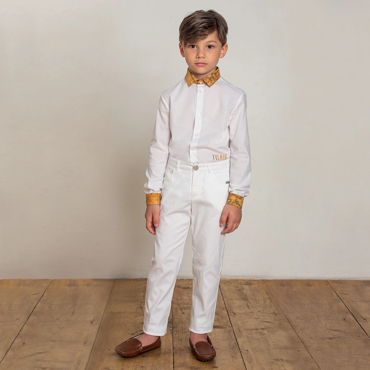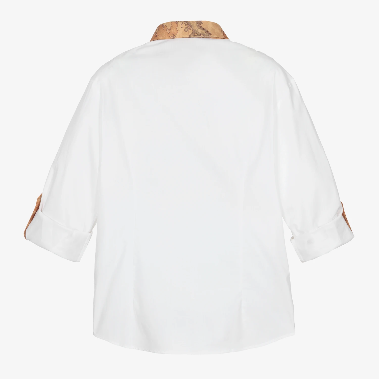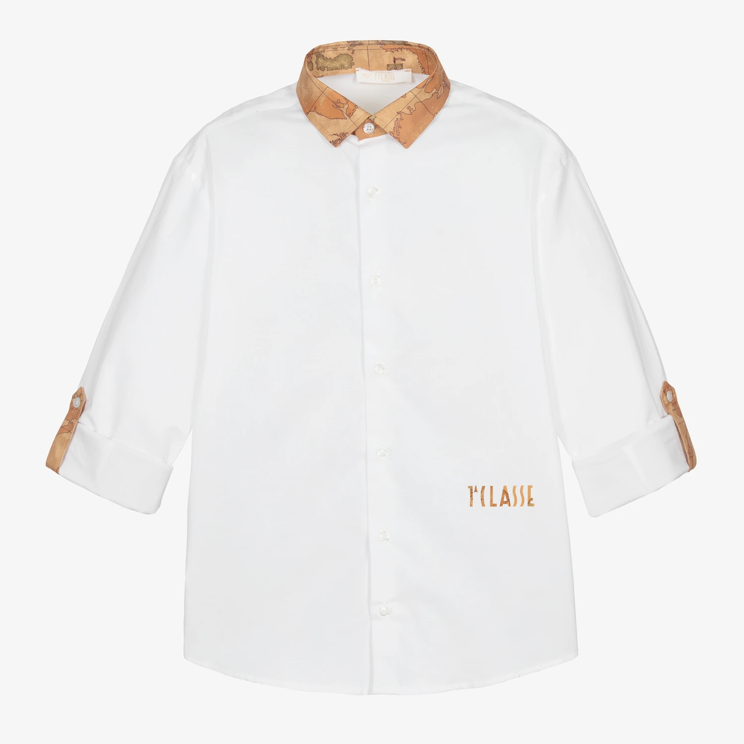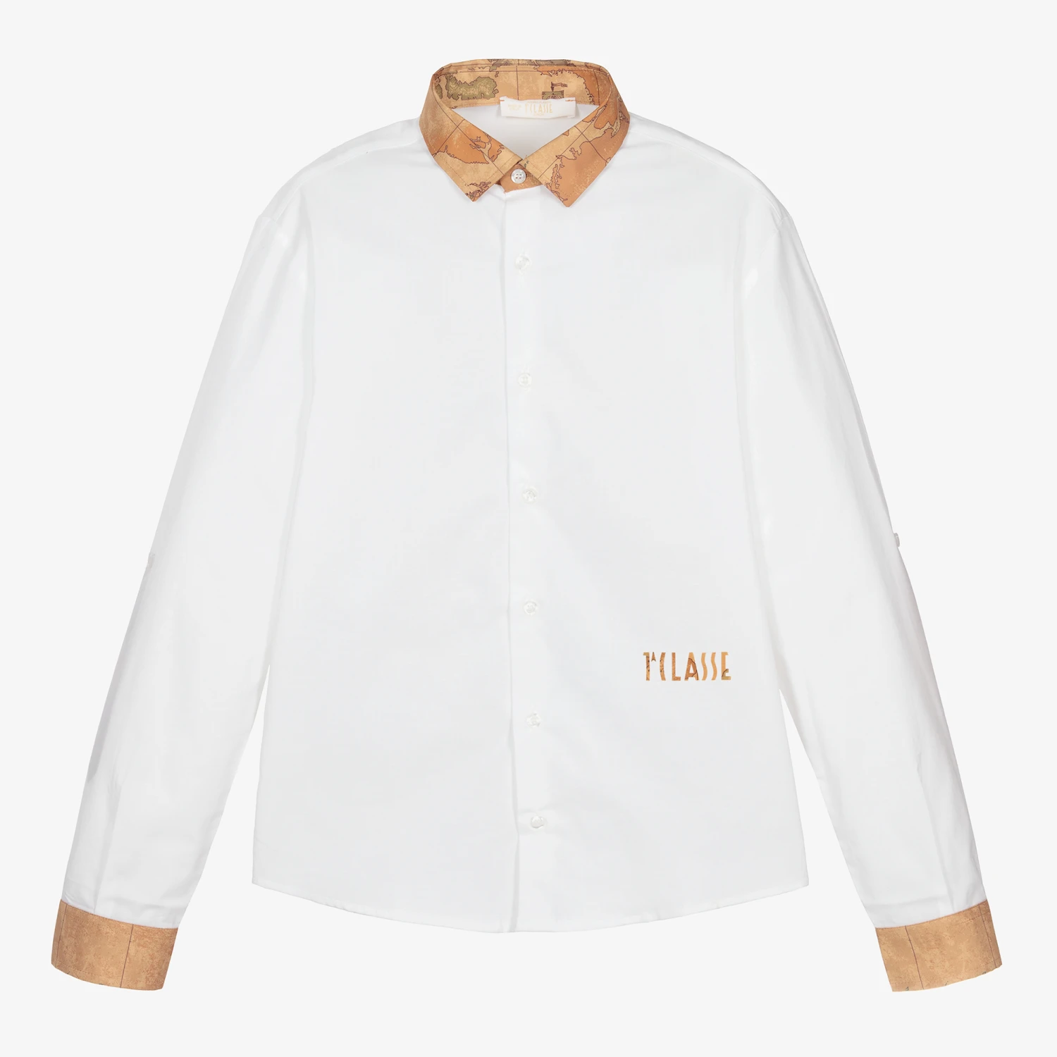 Smart white shirt for teen boys by Alviero Martini. The collar and cuffs are trimmed in the brand’s iconic dark beige Geo map print, with a matching 1a Classe logo on the front. Made in soft cotton poplin with stretch, it has branded button fastenings on the front and cuffs. The sleeves can be rolled up for more casual styling.