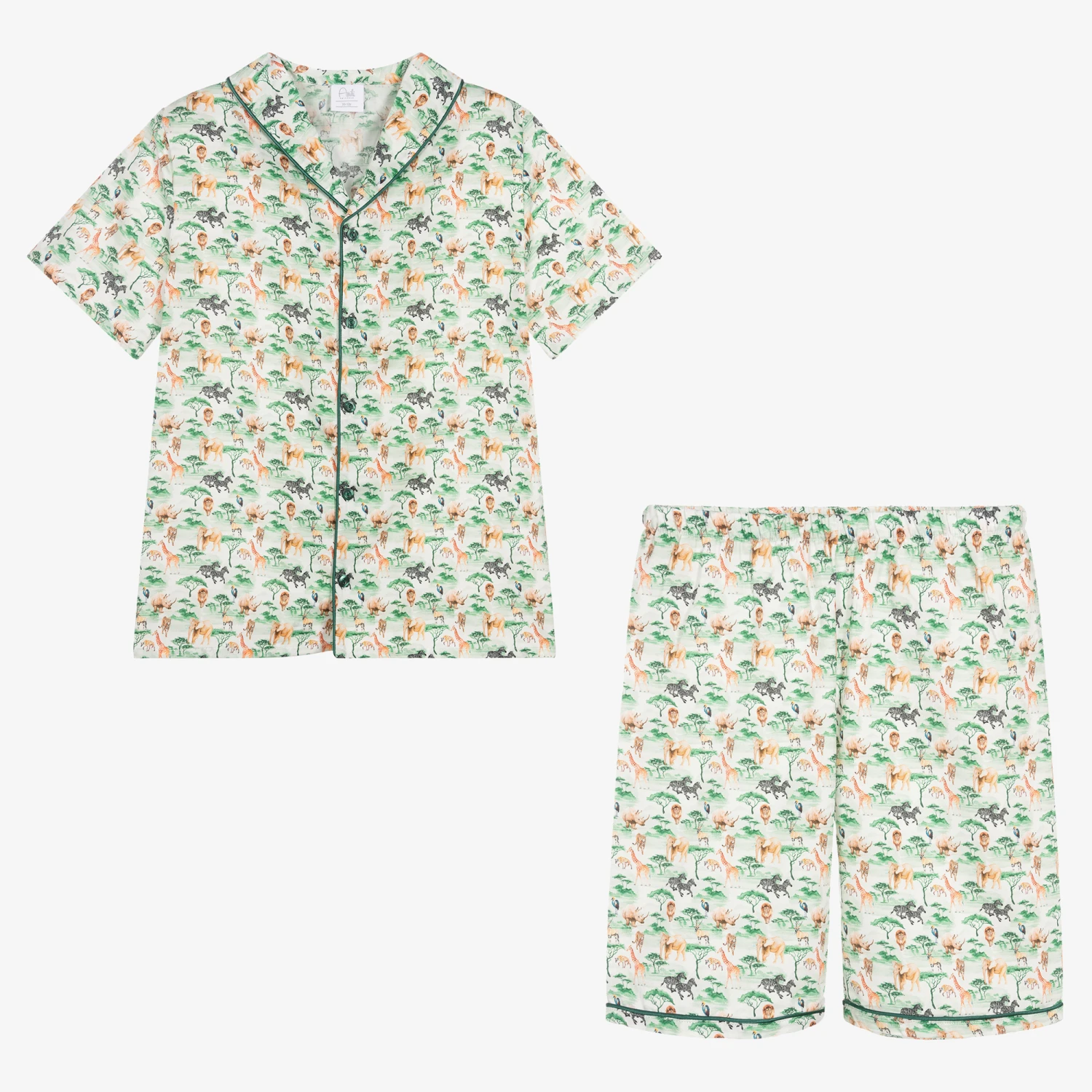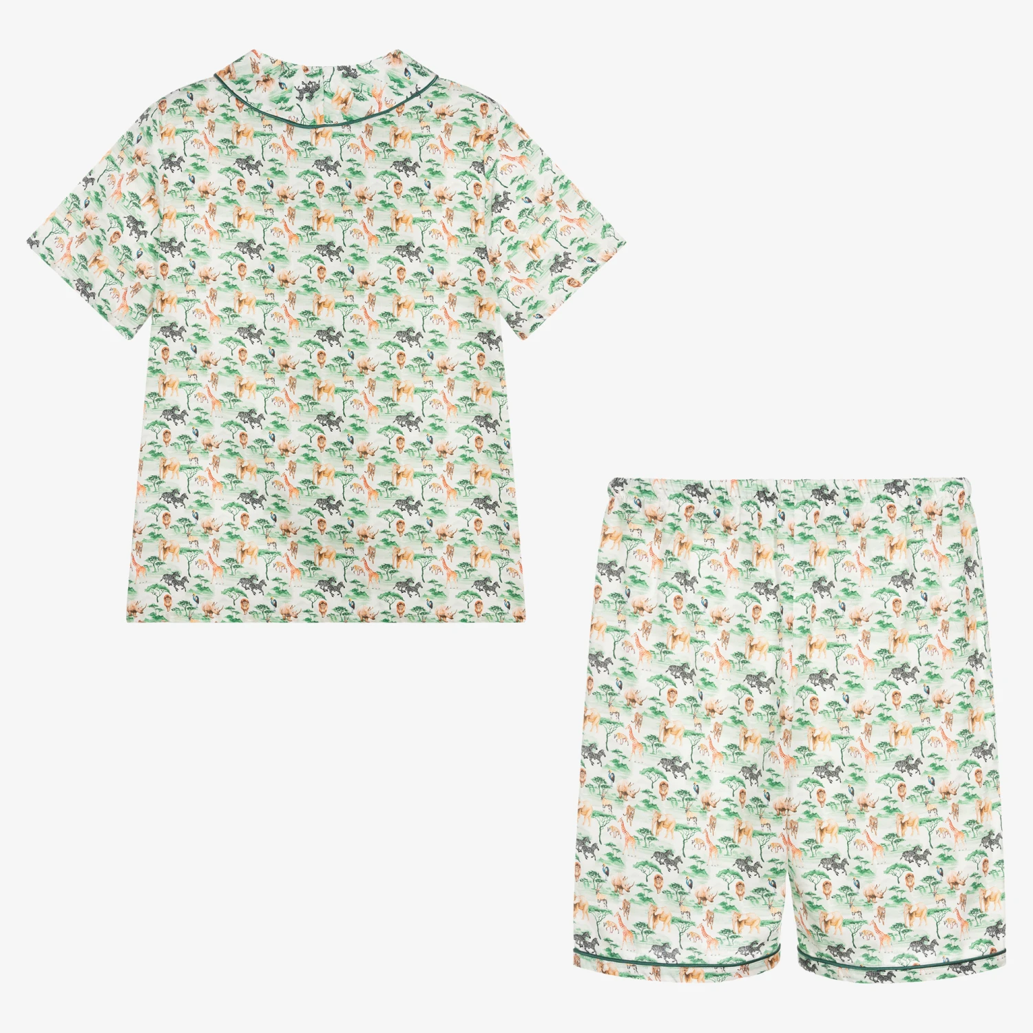 Classic green and ivory short pyjamas for teen boys by AMIKI Children, in a lovely and colourful safari animal pattern. Made in luxury soft and lightweight cotton in a comfortable loose-fit, both pieces are trimmed with matching dark green satin piping. The shirt has a revere collar and front button fastenings, whilst the shorts have a comfortable, elasticated waistband.