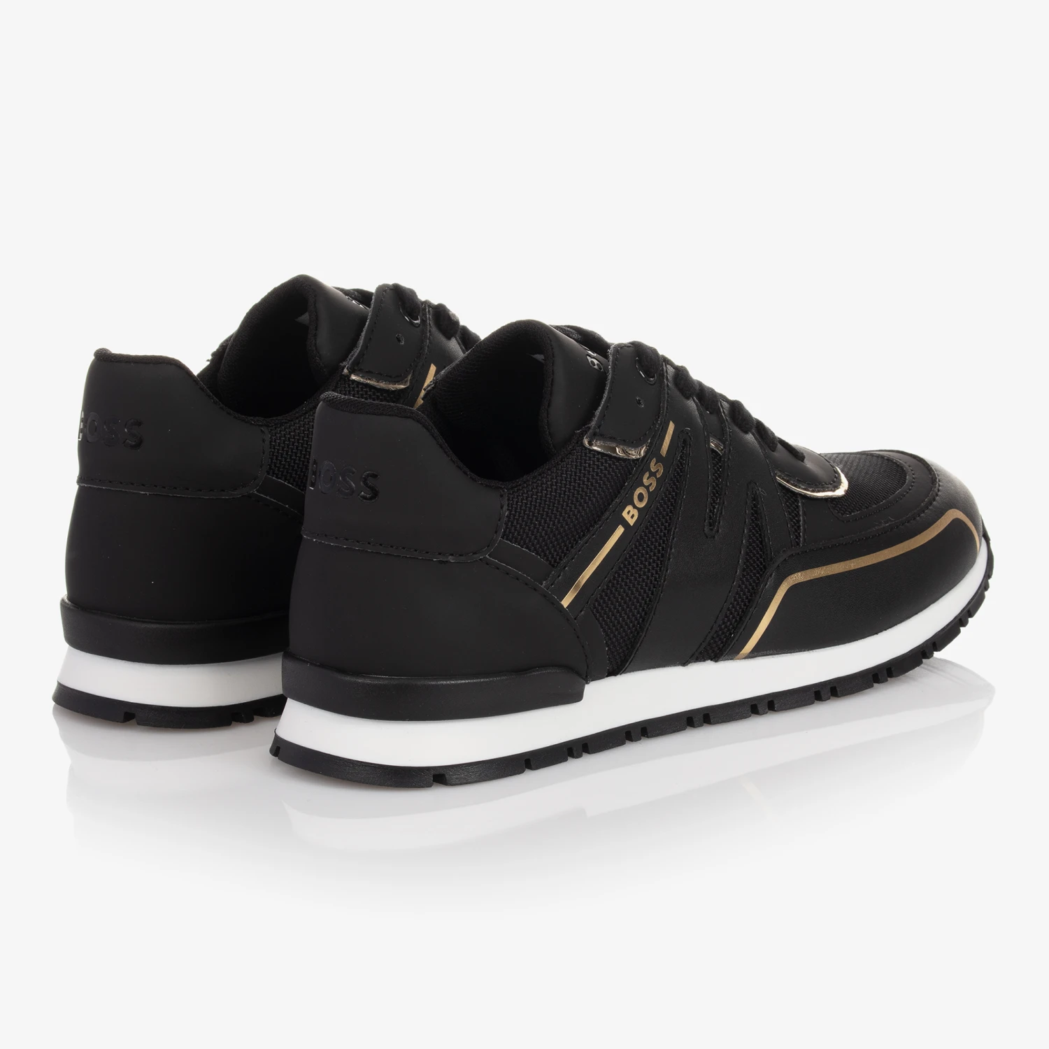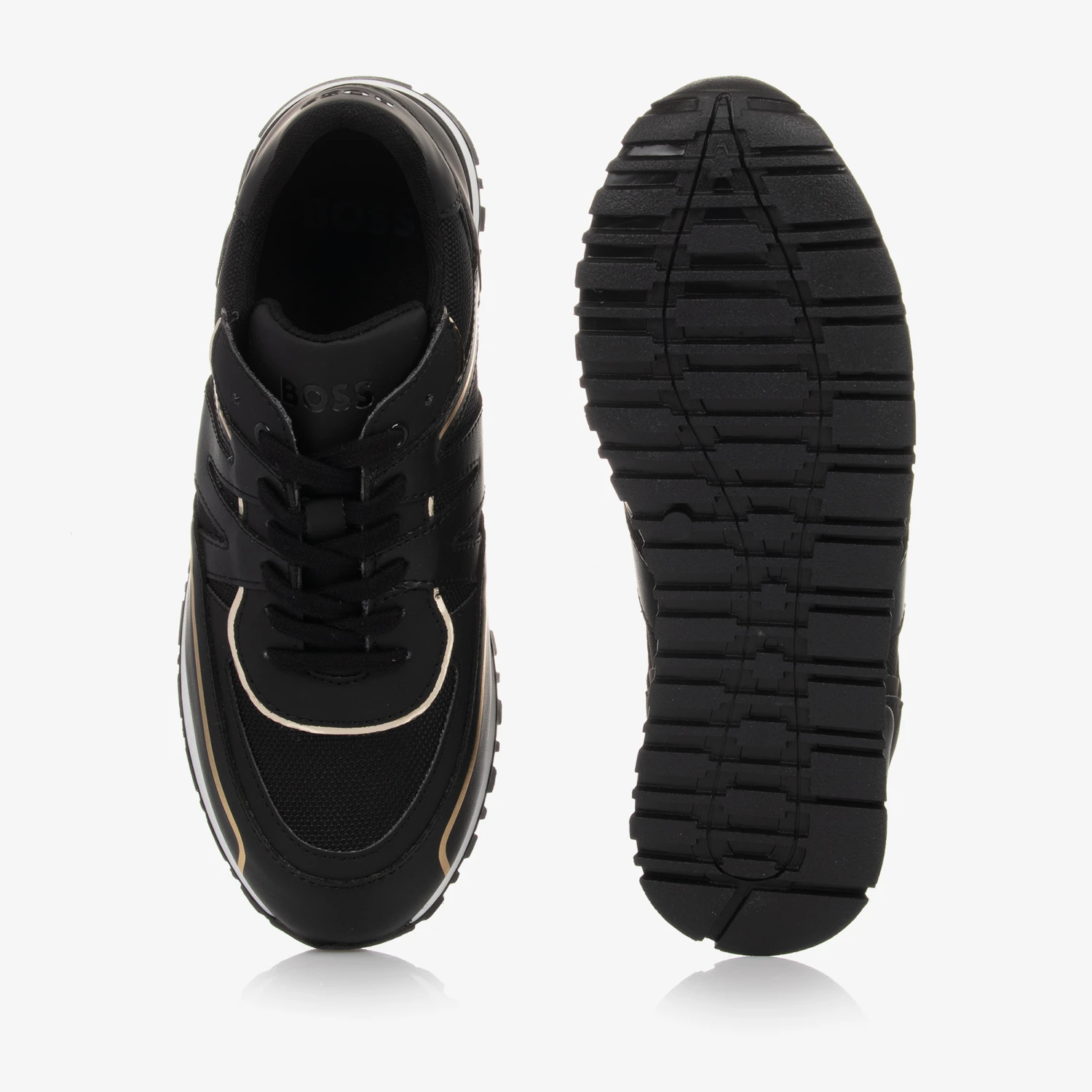 Black lace-up trainers for teen boys by BOSS Kidswear, made with soft faux leather. They have stylish metallic gold trims and an embossed logo on the tongue. With breathable onSteam® microfibre mesh, they are lined in soft fabric and have non-slip rubber soles.