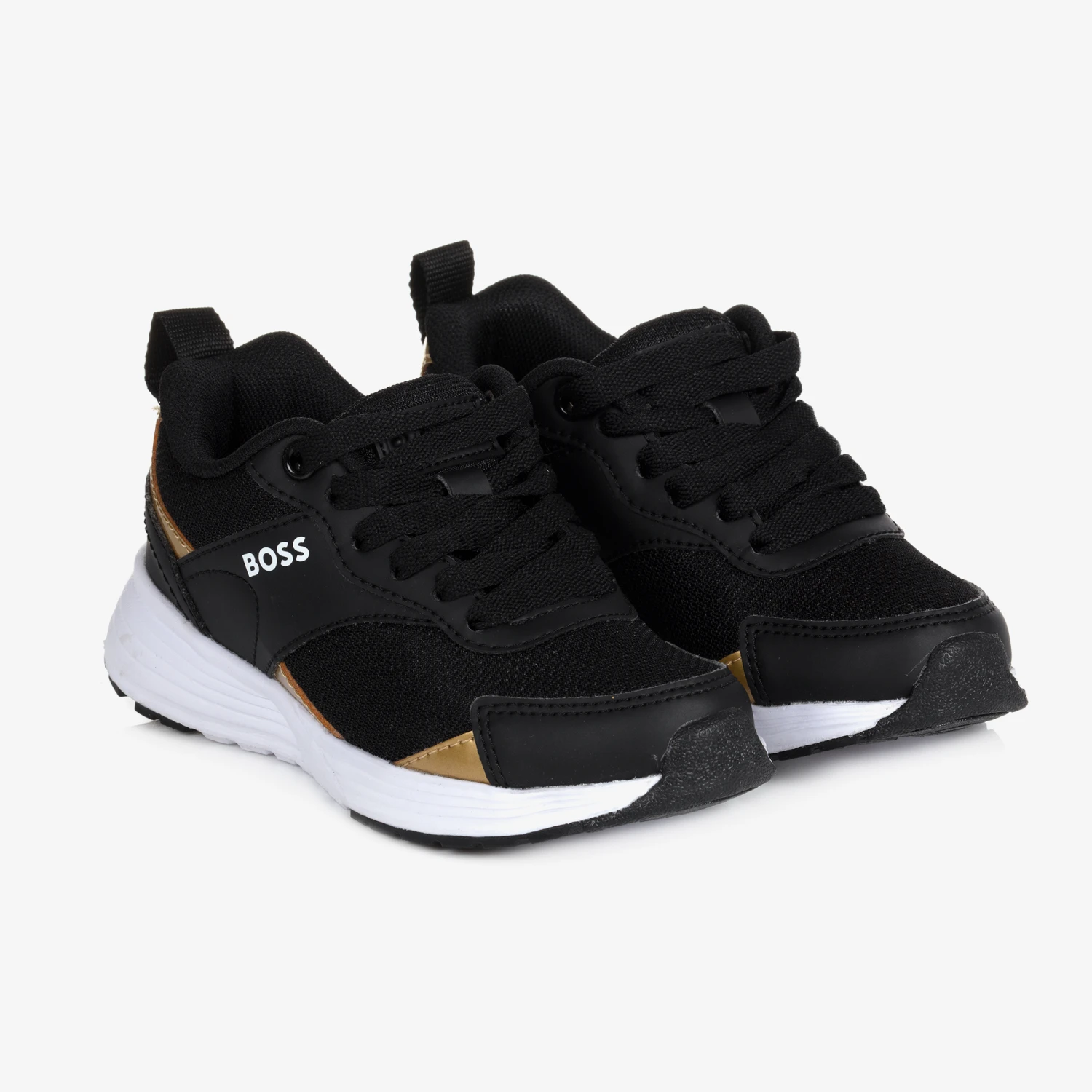 Black lace-up trainers for teen boys from German brand BOSS, as seen in the main collection. The uppers are crafted in breathable mesh and smooth faux leather with opulent shiny gold trims. The label’s distinctive logo is tamped on the side and embossed on the tongue in white for added designer touches. These lightweight, comfortable sneakers are finished with a textile lining and white non-slip rubber soles.
