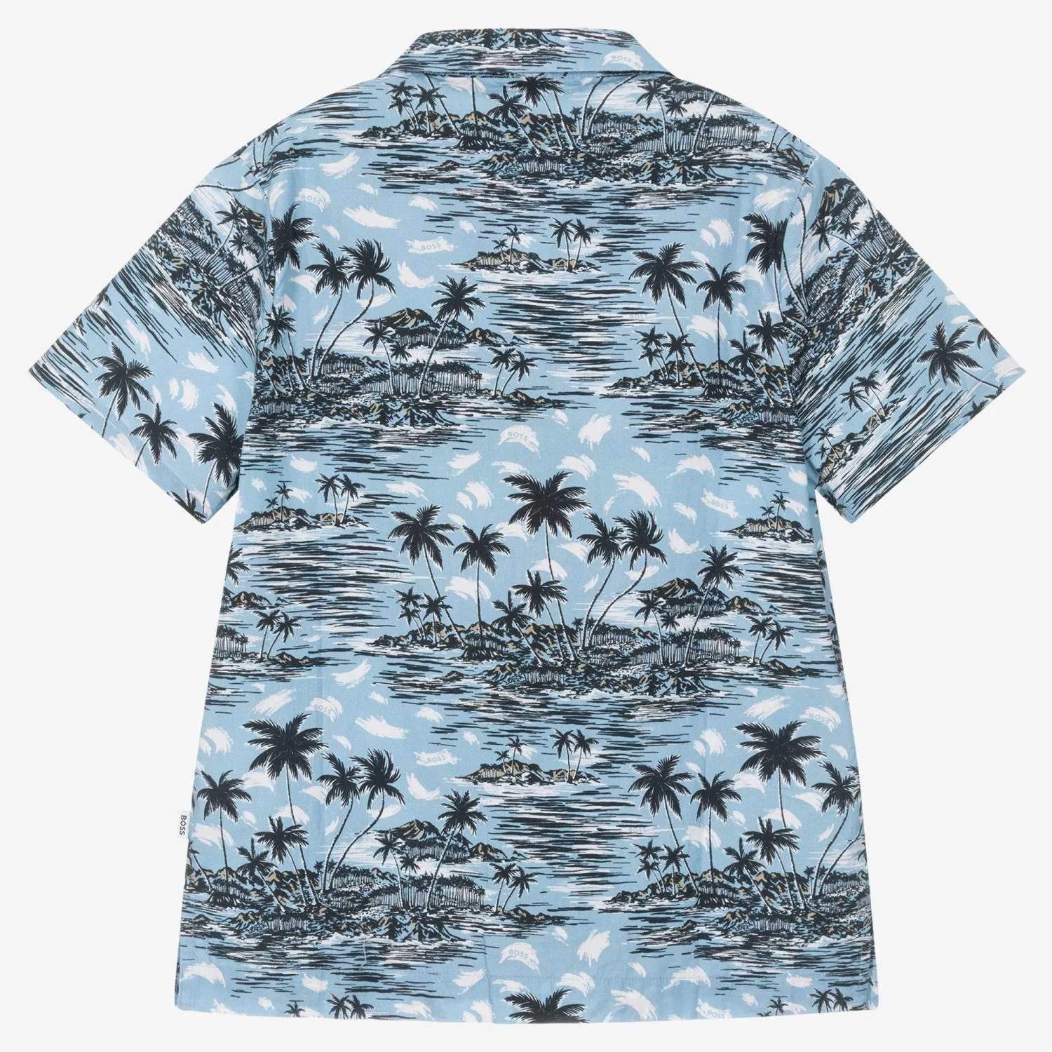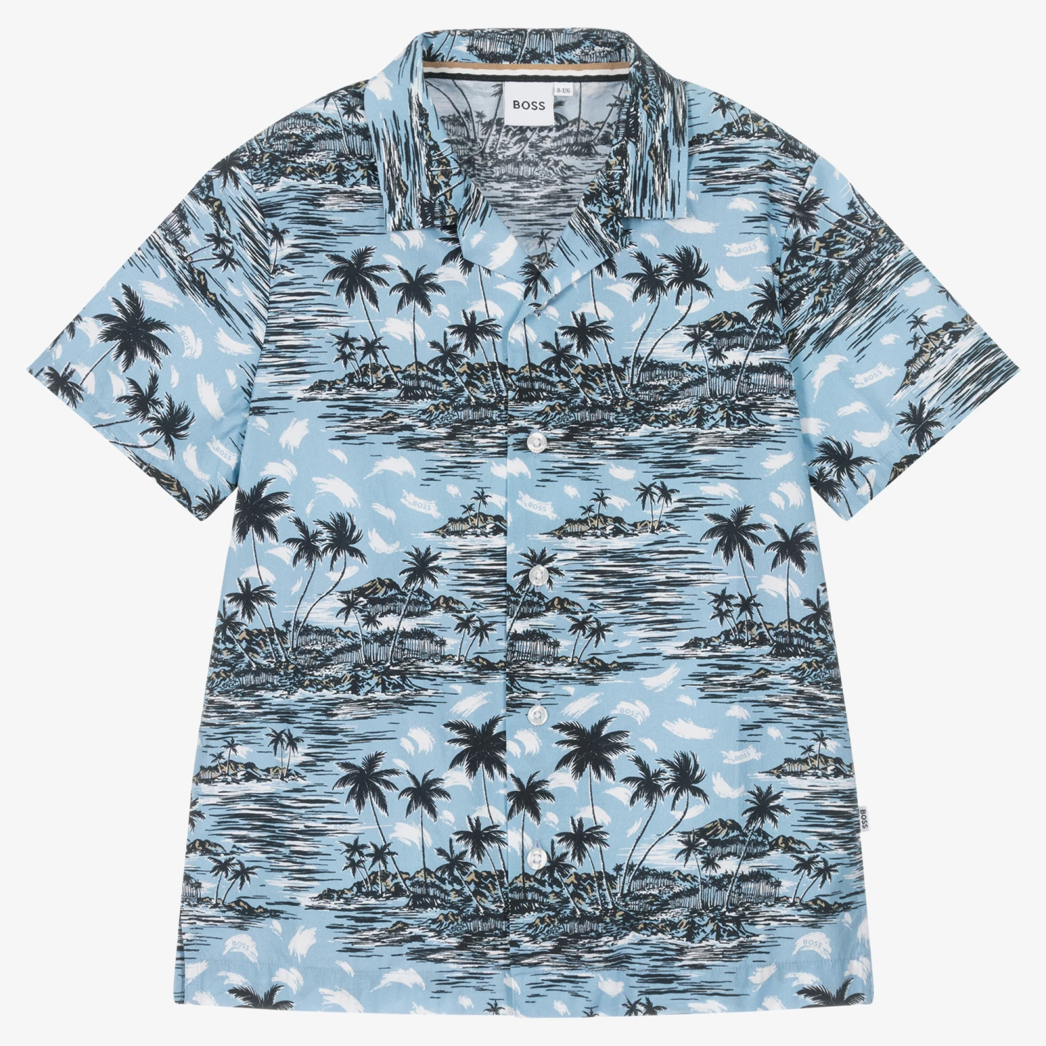 Summery blue cotton shirt for teen boys by BOSS, with a revere collar. Ideal for holidaying by the sea, this cool resort shirt has an all-over tropical palm tree print, with subtle logos.