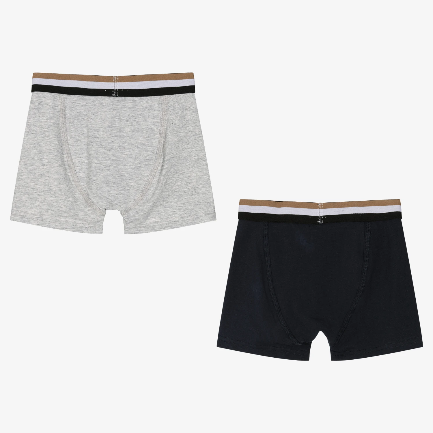 Pack of two navy blue and grey marl boxer shorts for teen boys from BOSS. Soft, stretchy and comfortable, these cotton jersey boxers have a stretchy, jacquard logo waistband with the designer’s signature tricolour stripes. Logo lettering is stamped on the hem for extra branded detailing.