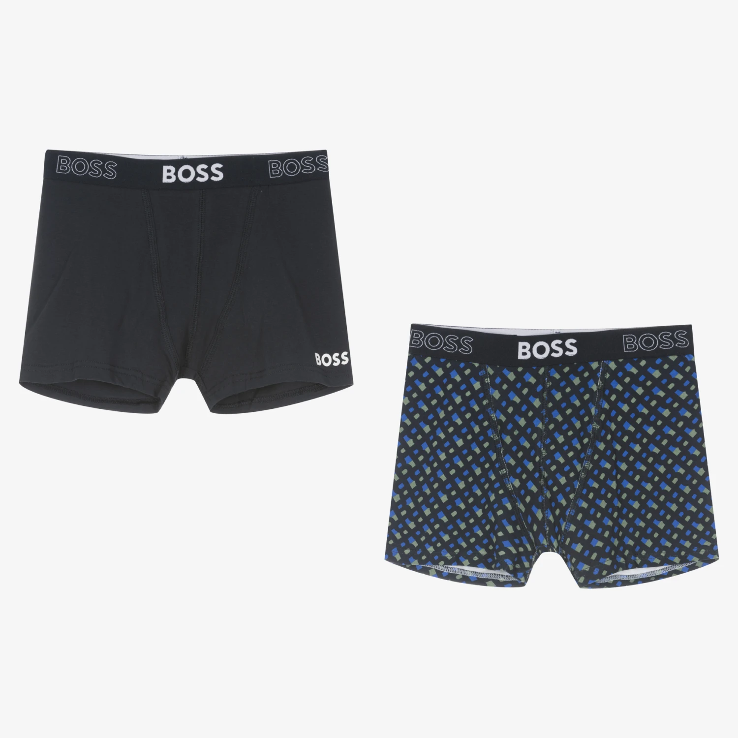 A two-pack of boxer shorts for teen boys by BOSS, made from soft and stretchy cotton jersey for ultimate comfort. One pair comes in a dark navy blue with a white logo print on one leg. The other is designed in the brand’s distinctive all-over navy blue monogram logo pattern. Both styles feature the brand name woven into the elasticated waistband for a signature finish.