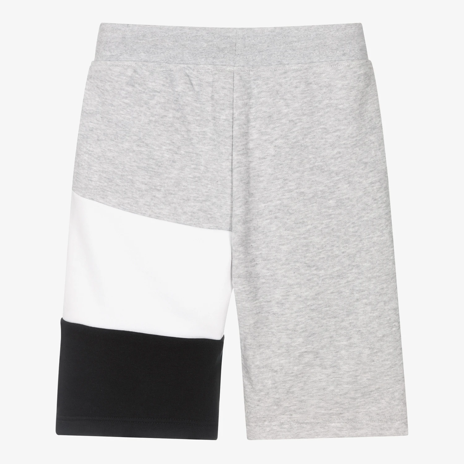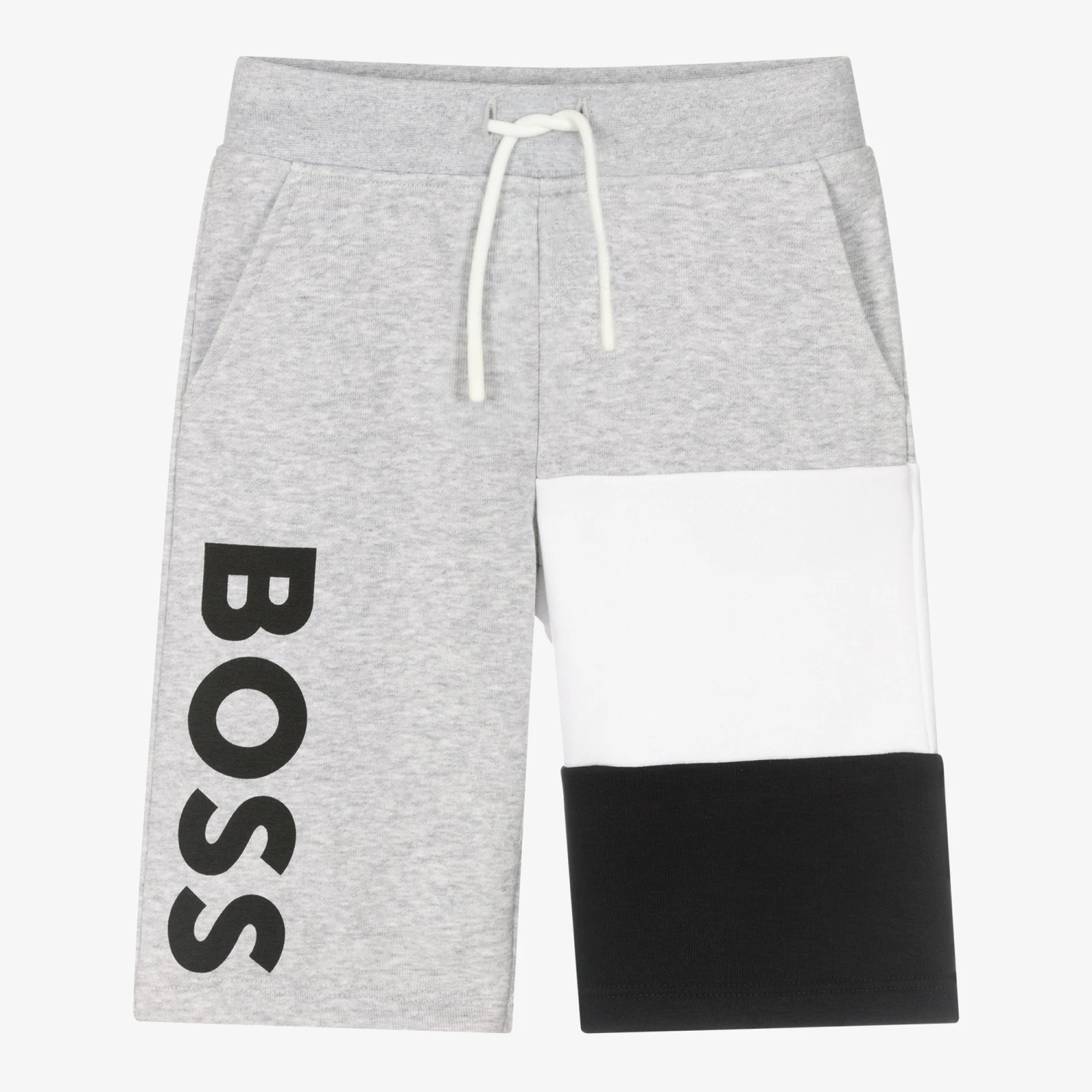 Colourblock shorts for teen boys by BOSS, in grey marl, white and black. Bermuda length, this casual style is made in comfortable cotton sweatshirt jersey, with slanted front pockets and a drawstring waist for a great fit. A bold black logo print on one leg gives a distinctive designer finish.