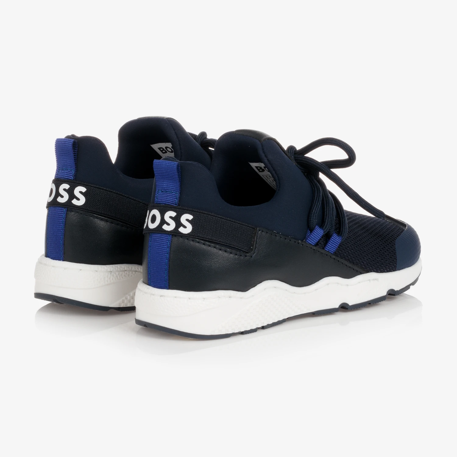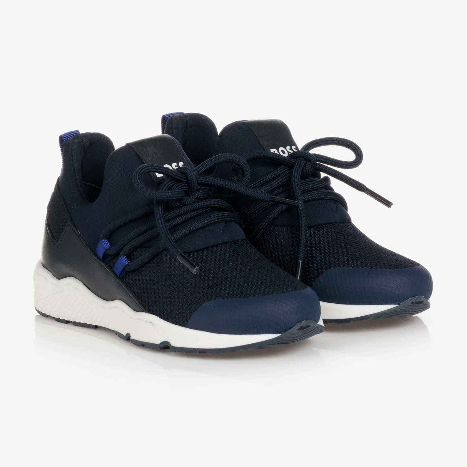 Sporty navy blue trainers for teen boys by BOSS, trimmed with the brand’s iconic white logos and striped details. Crafted in padded textiles with luxe leather trims, these versatile low-tops fasten with laces on the front and have a fixed logo tongue for contemporary styling. They have a faux leather insole and chunky non-slip outer soles for practicality and on-trend style.