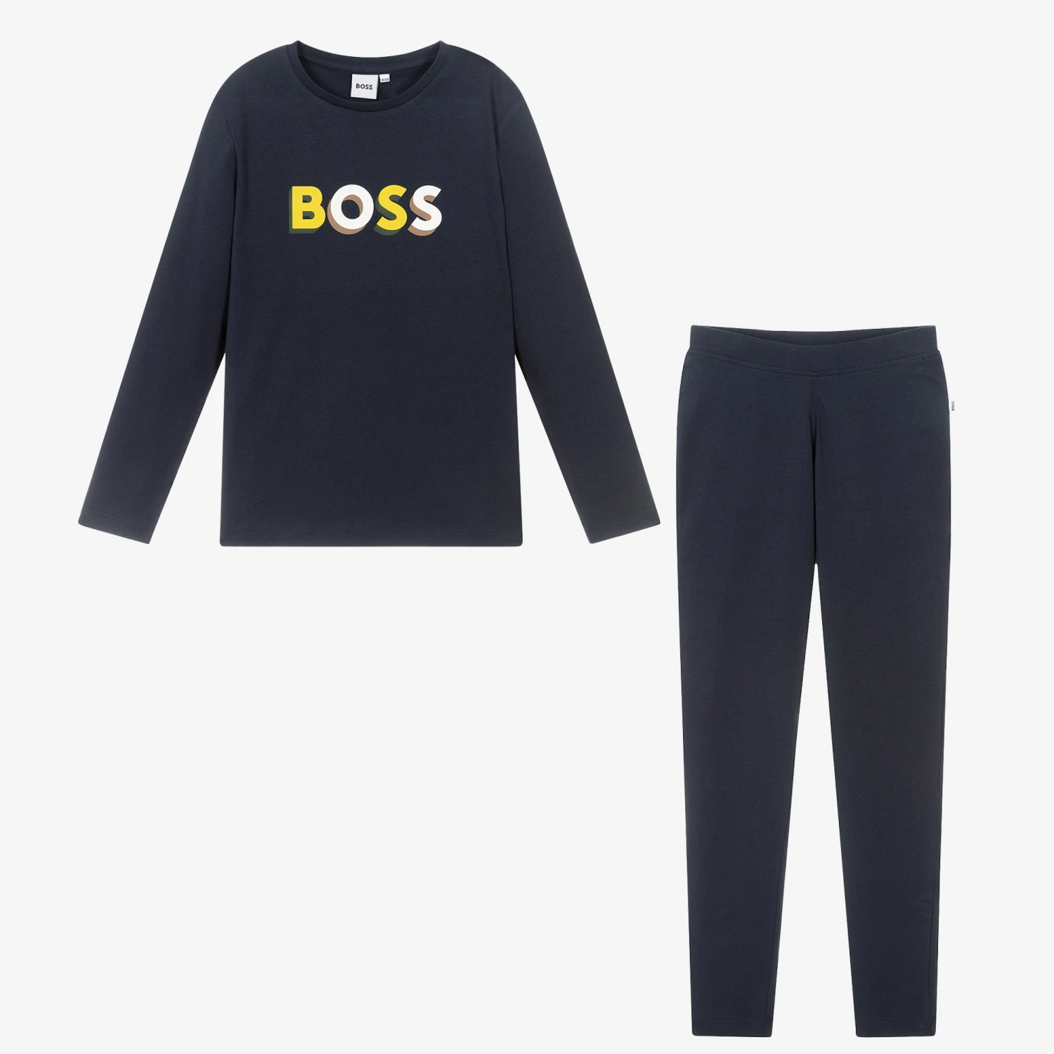 Navy blue pyjamas for teen boys from BOSS. The long-sleeved top has a 3D effect designer logo print in white, beige and lime green. The bottoms have an elasticated waist for easy wear and a woven logo tab on the side seam. Both pieces are made in luxuriously soft and stretchy cotton jersey for comfort. These pyjamas are presented in a branded storage pouch, ideal for travelling.