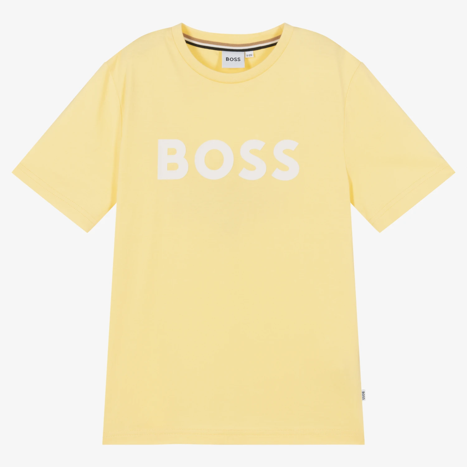 This teen boys yellow T-shirt from BOSS is made in soft cotton jersey. Sporty in its design, there is a white rubber logo print on the front for a recognisable look.