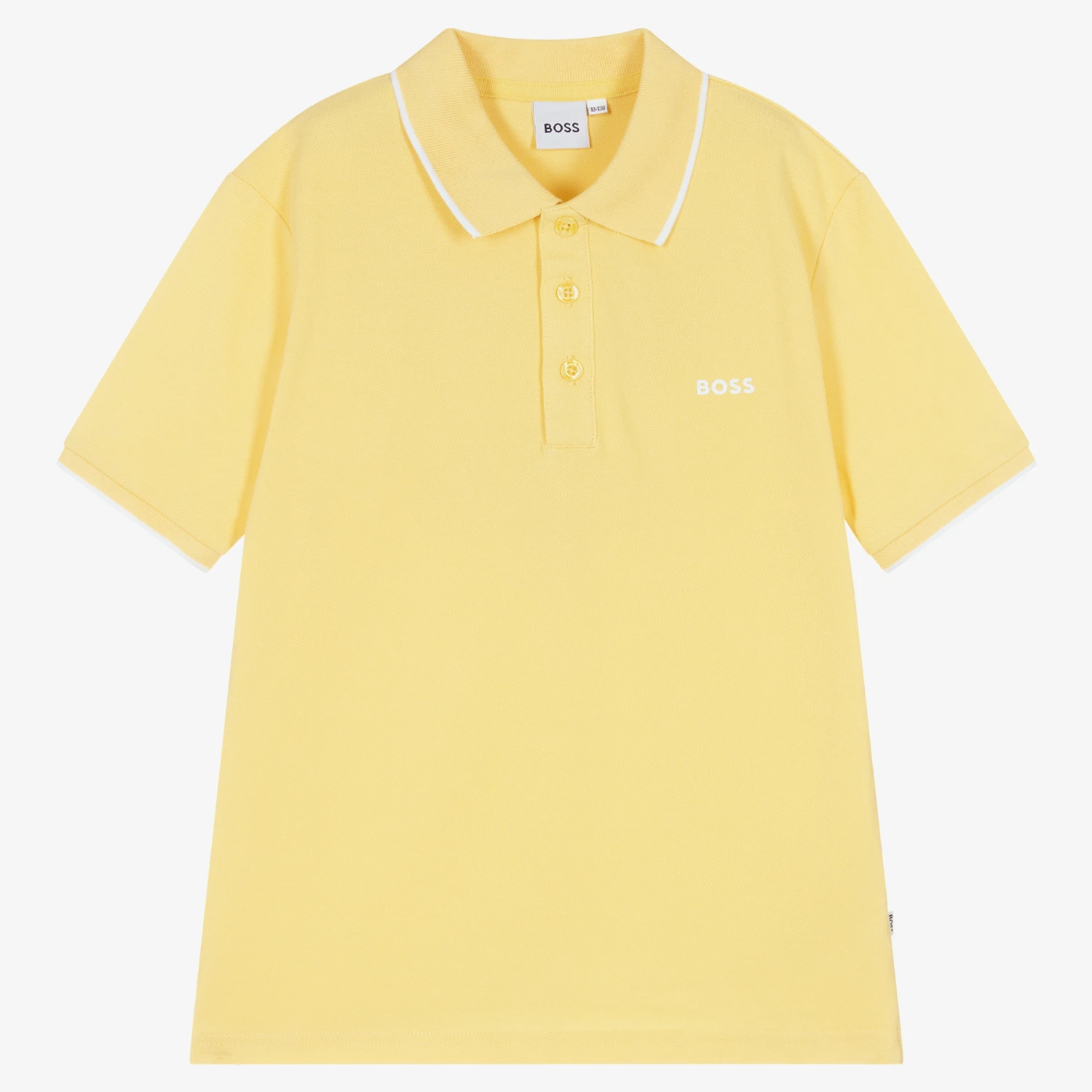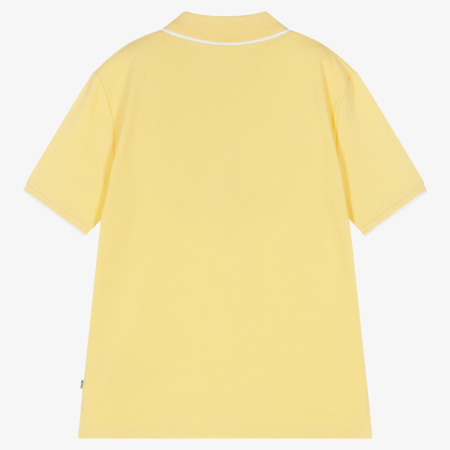Teen boys yellow polo shirt by BOSS, with a white rubber logo on the chest and contrasting white tipped trims. Made in soft cotton piqué for all-day comfort, it fastens with small logo buttons on the front placket, with a small logo tab on the side seam adding further designer detail.
