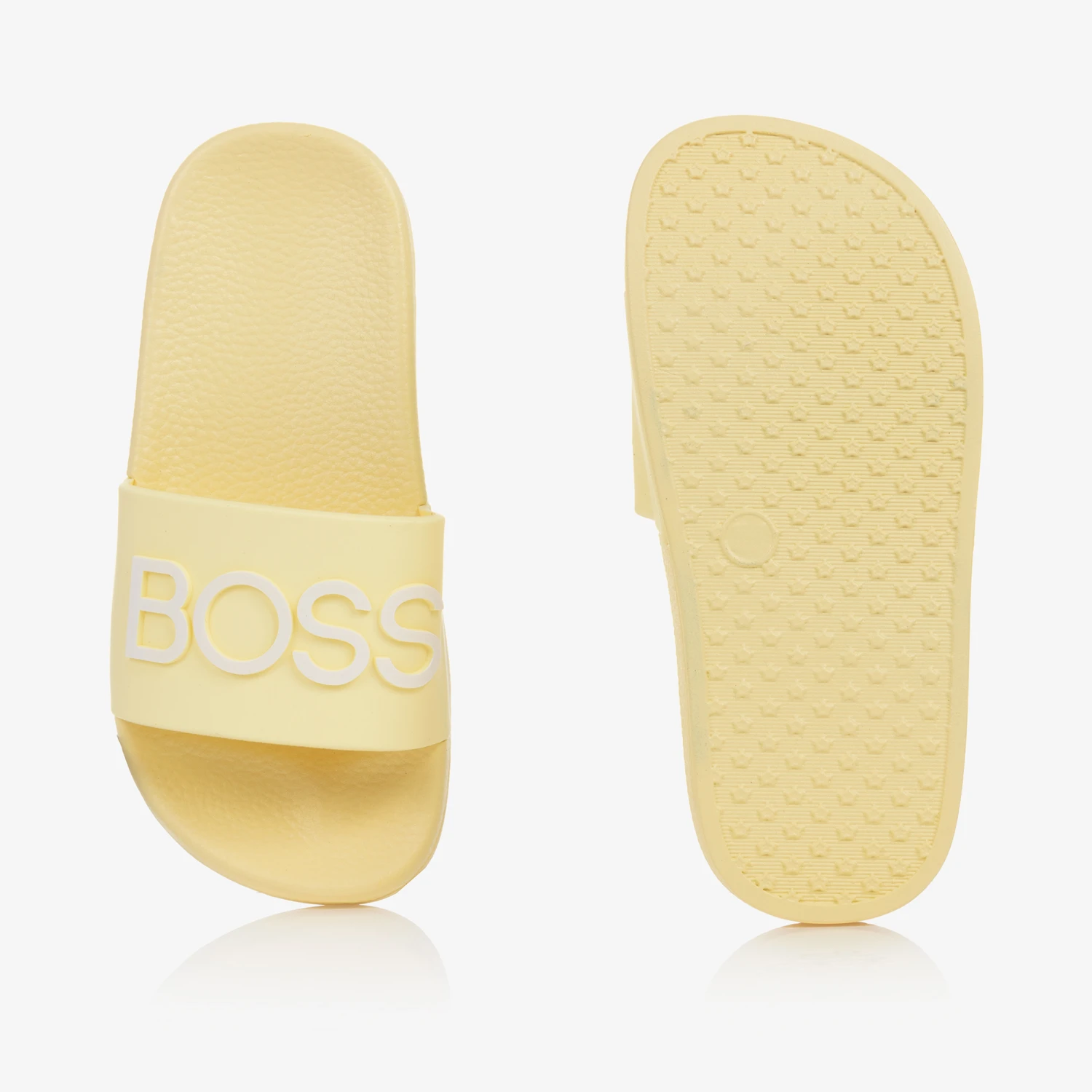 Pale yellow sliders for teen boys and girls from German label BOSS. The soft and smooth silicone foot strap is embossed with a stand-out white logo for a little extra designer appeal. The firm footbed is slightly contoured for a comfortable fit and the soles are textured to improve grip.