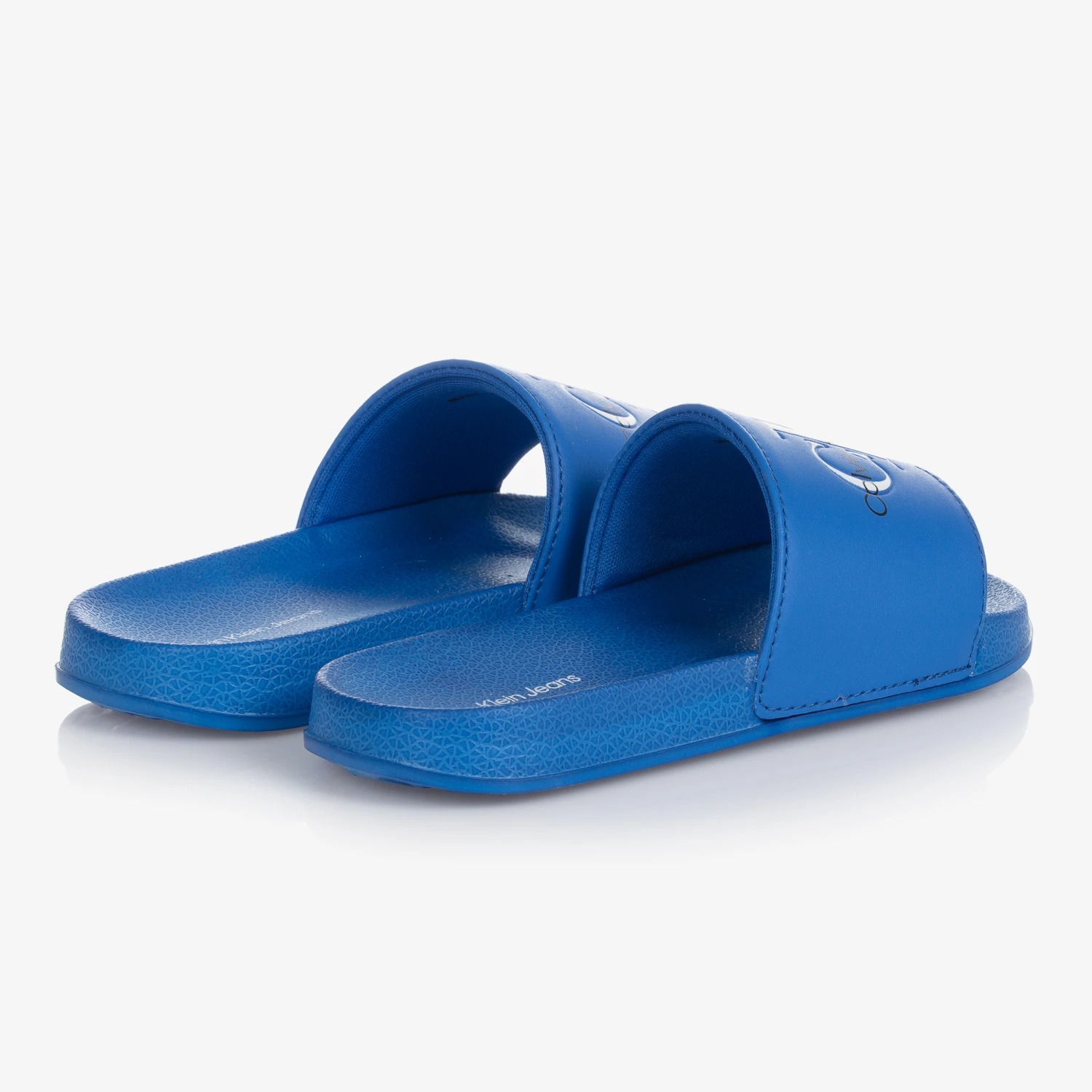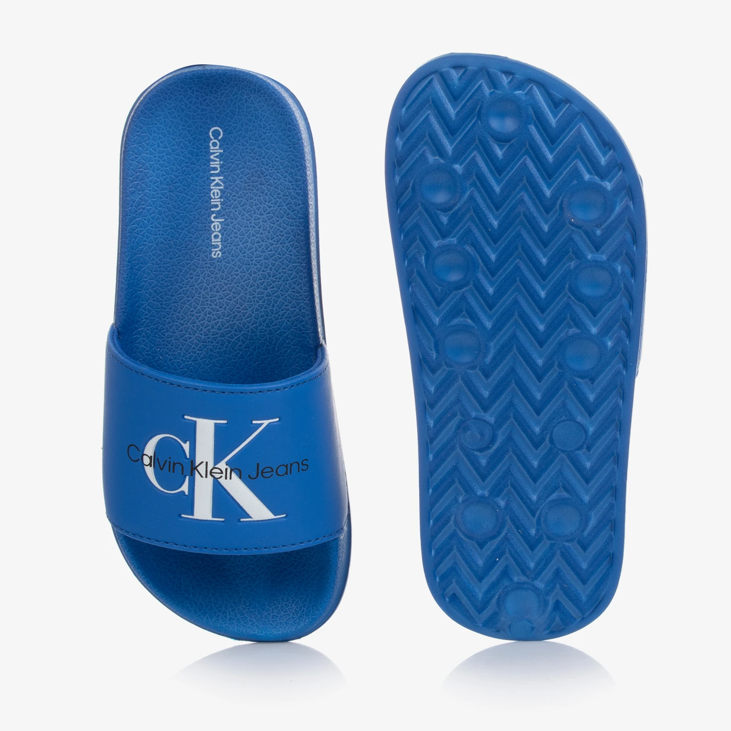 Royal blue rubberised sliders for teen boys by Calvin Klein Jeans, made with faux leather uppers. The strap has a white and black Calvin Klein monogram embossed logo. They have a non-slip rubber sole and a moulded footbed.