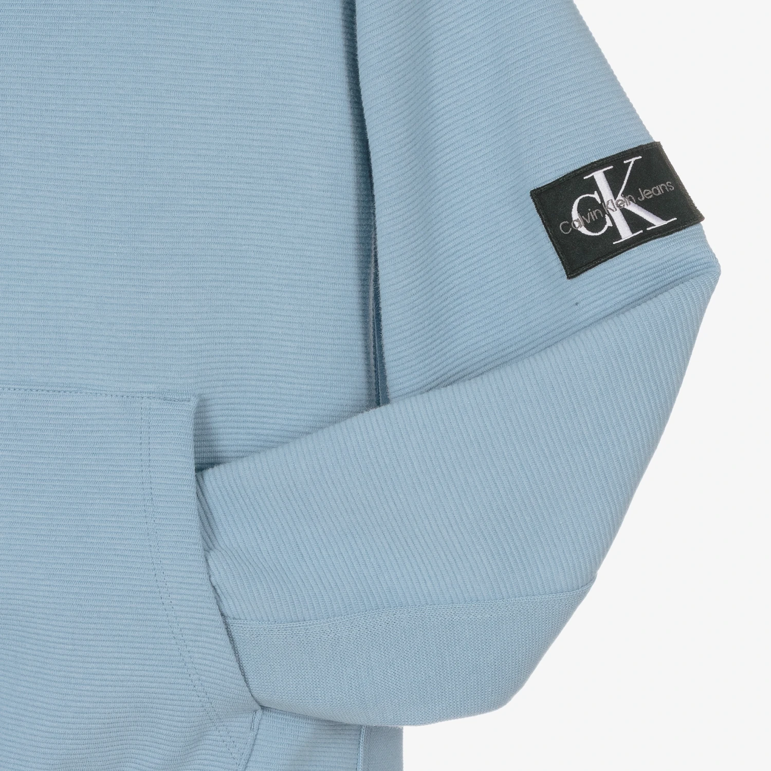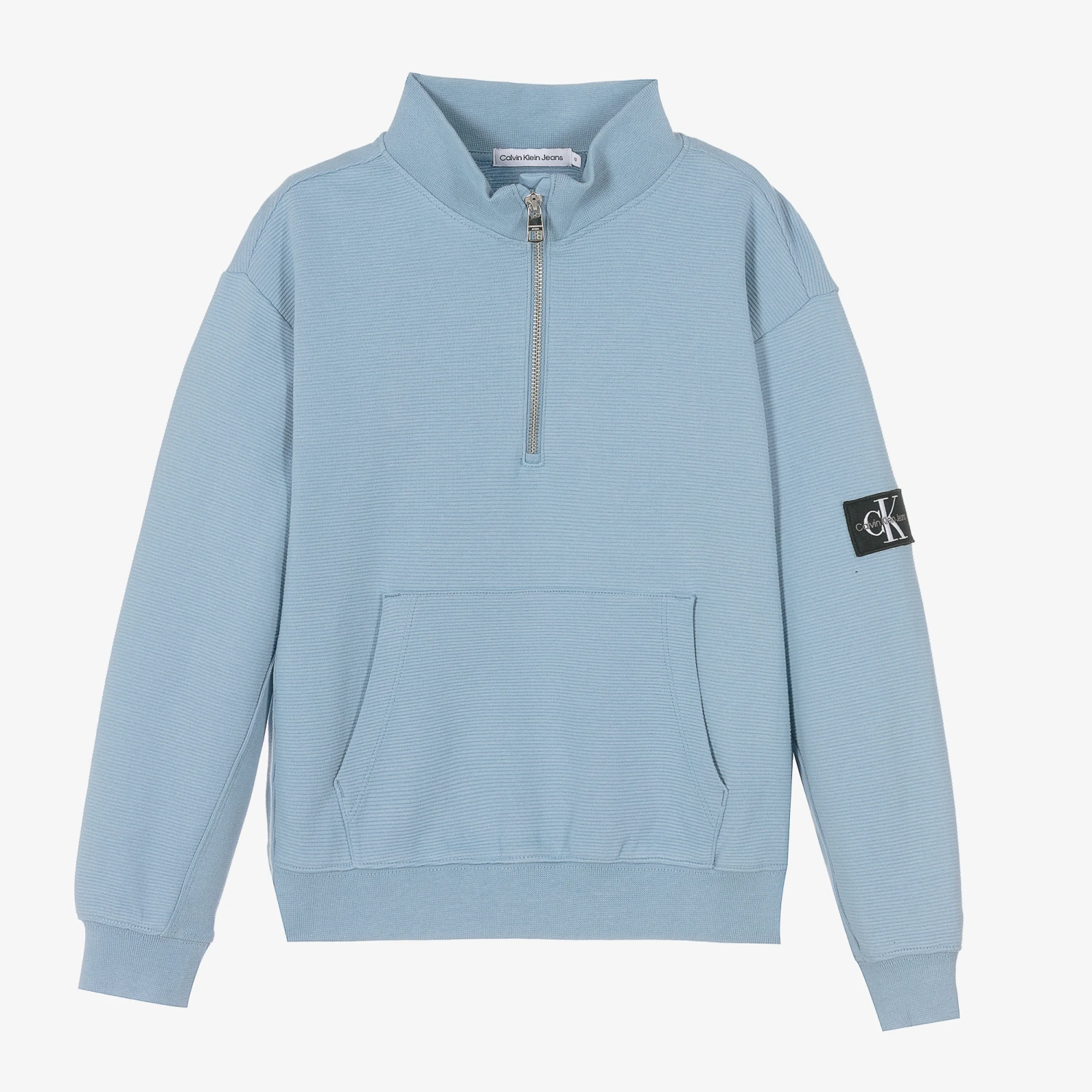 Ice blue cotton top for teen boys by Calvin Klein Jeans. Mid-weight and textured it has an elasticated, stand-up collar with a silver half-zip fastening on the front, and matching trims on the cuffs and hemline. There is a useful pouch pocket on the front and an embroidered monogram logo badge on one sleeve in black and white. This sweatshirt contains at least 50% transitional organic cotton that supports sustainable farming.