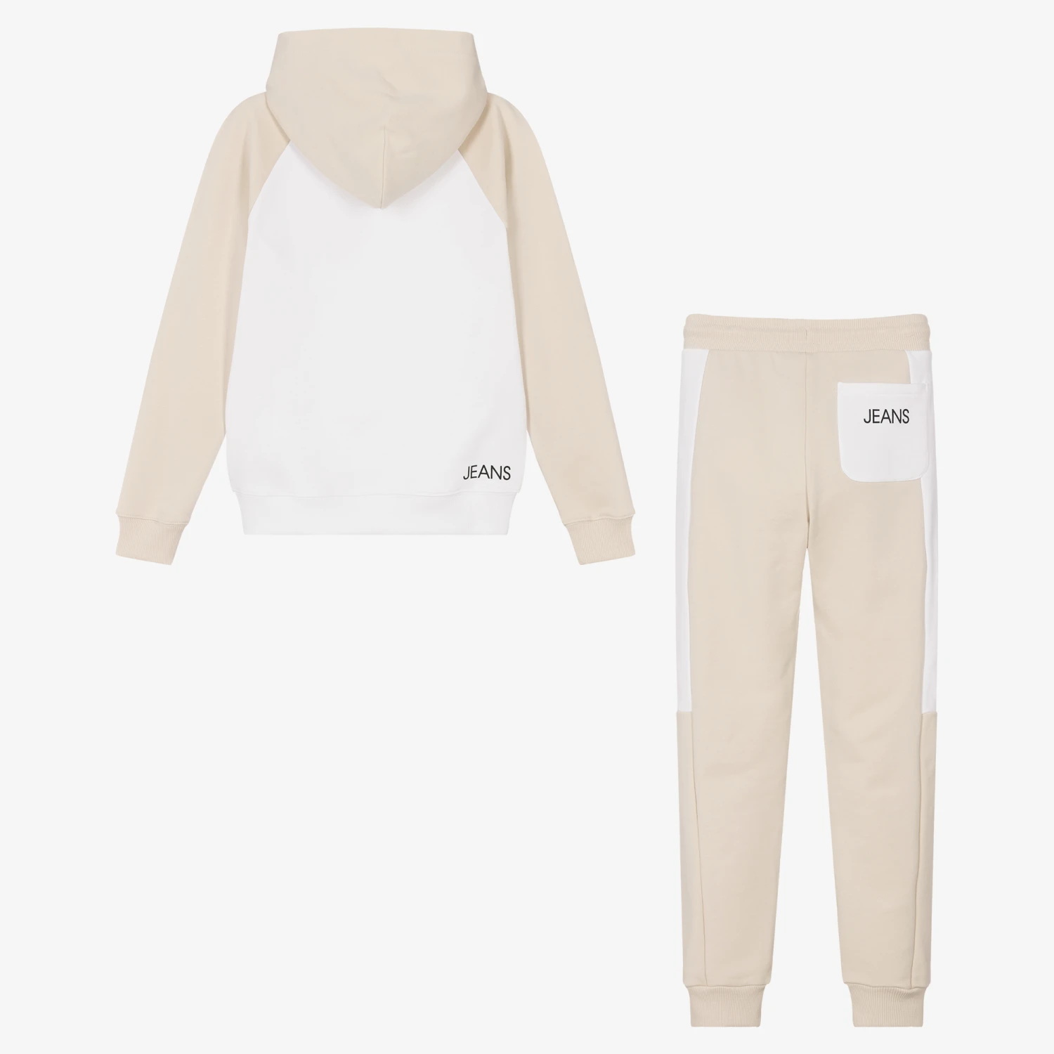 Great for sports or loungewear, this beige and ivory hooded tracksuit for teen boys is by Calvin Klein Jeans. Comfortable and easy to wear, it is made in soft mid-weight cotton jersey. Both pieces have black logo prints and the joggers have an elasticated drawstring waist for a good fit.