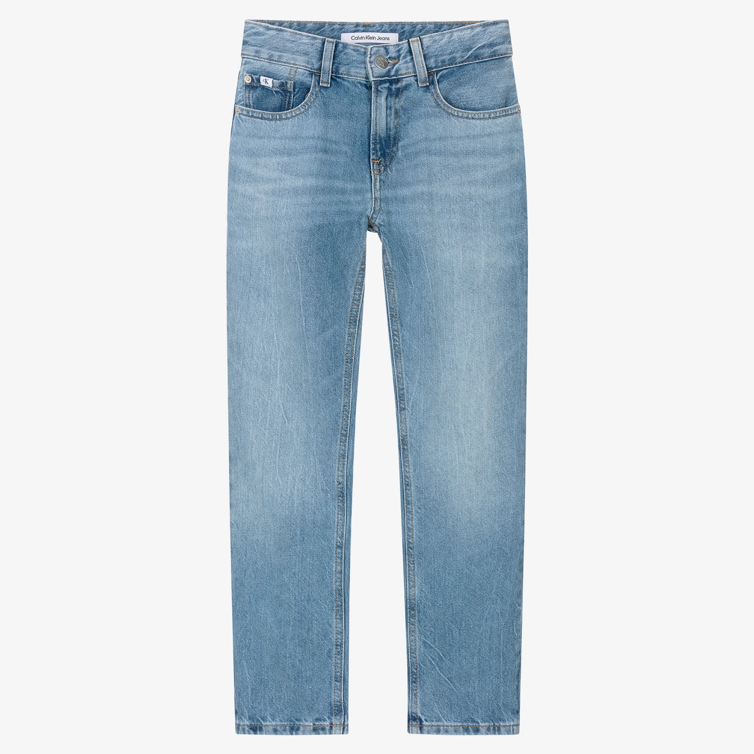 Mid-blue wash jeans for teen boys by Calvin Klein Jeans. With classic five pocket styling, they have a logo tab on the front coin pocket and a logo patch on one back pocket. They have a regular, straight fit and faded patches on the front and back. Made in soft cotton denim, they fasten with a logo button and zip and have a useful adjustable waist for a comfortable fit. This item contains 20% recycled cotton.