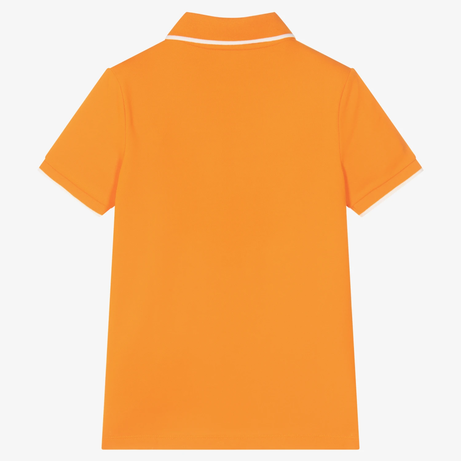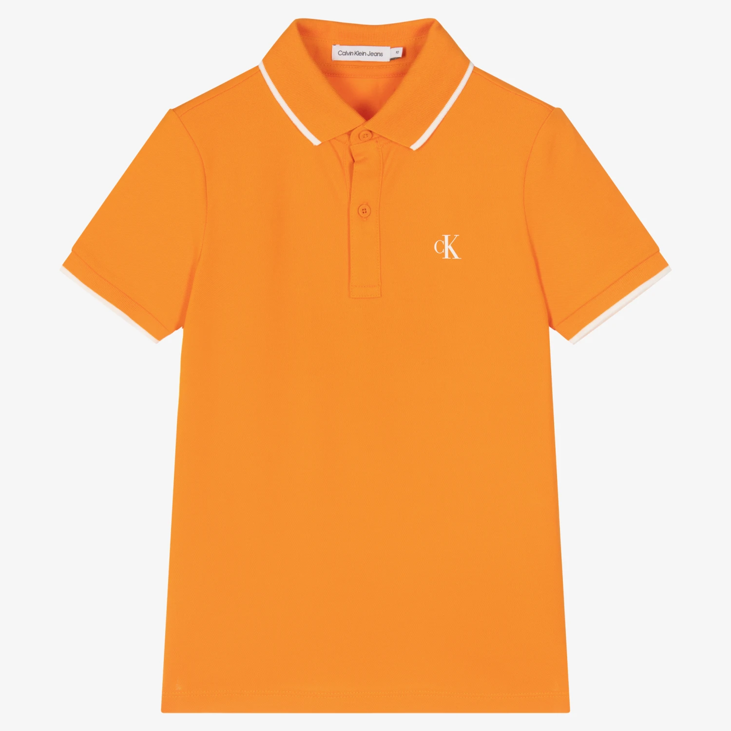 Orange with white trims, this classic polo shirt for teen boys is by Calvin Klein Jeans. It is made in soft cotton piqué, with a white CK monogram logo on the chest. There are front button fastenings, and comfortable side vents for ease of movement.