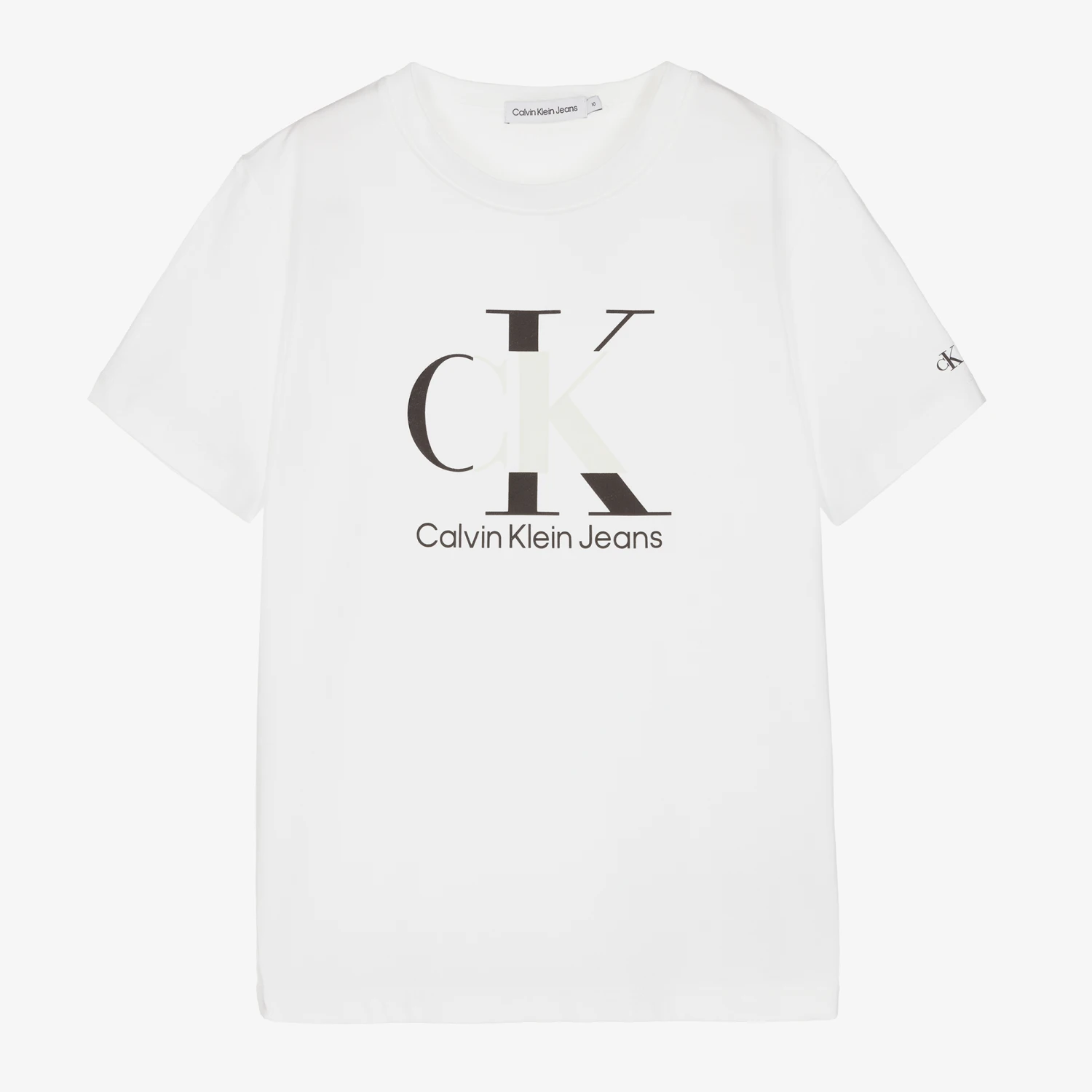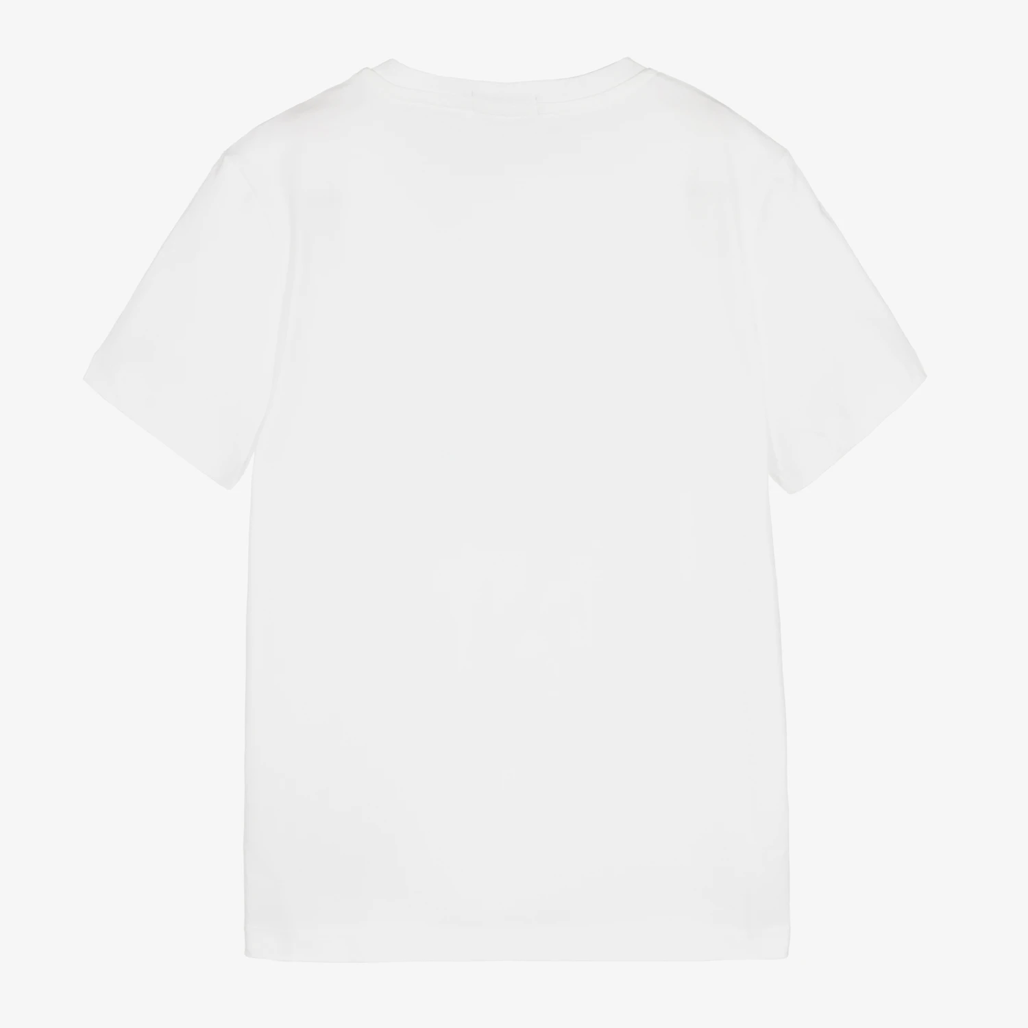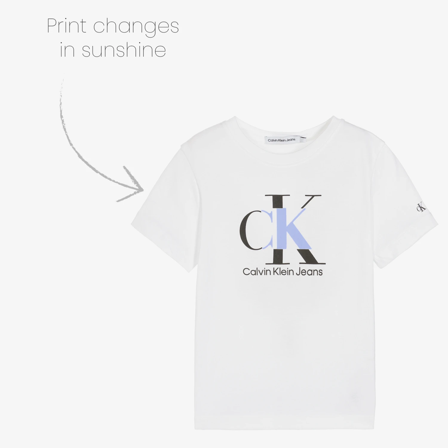 White T-shirt for teen boys by Calvin Klein Jeans, with the brand’s monogram logo printed on the front in black and white. Made in comfortable cotton jersey, the design has a sun reveal feature that causes the white print to turn blue when exposed to sunshine.