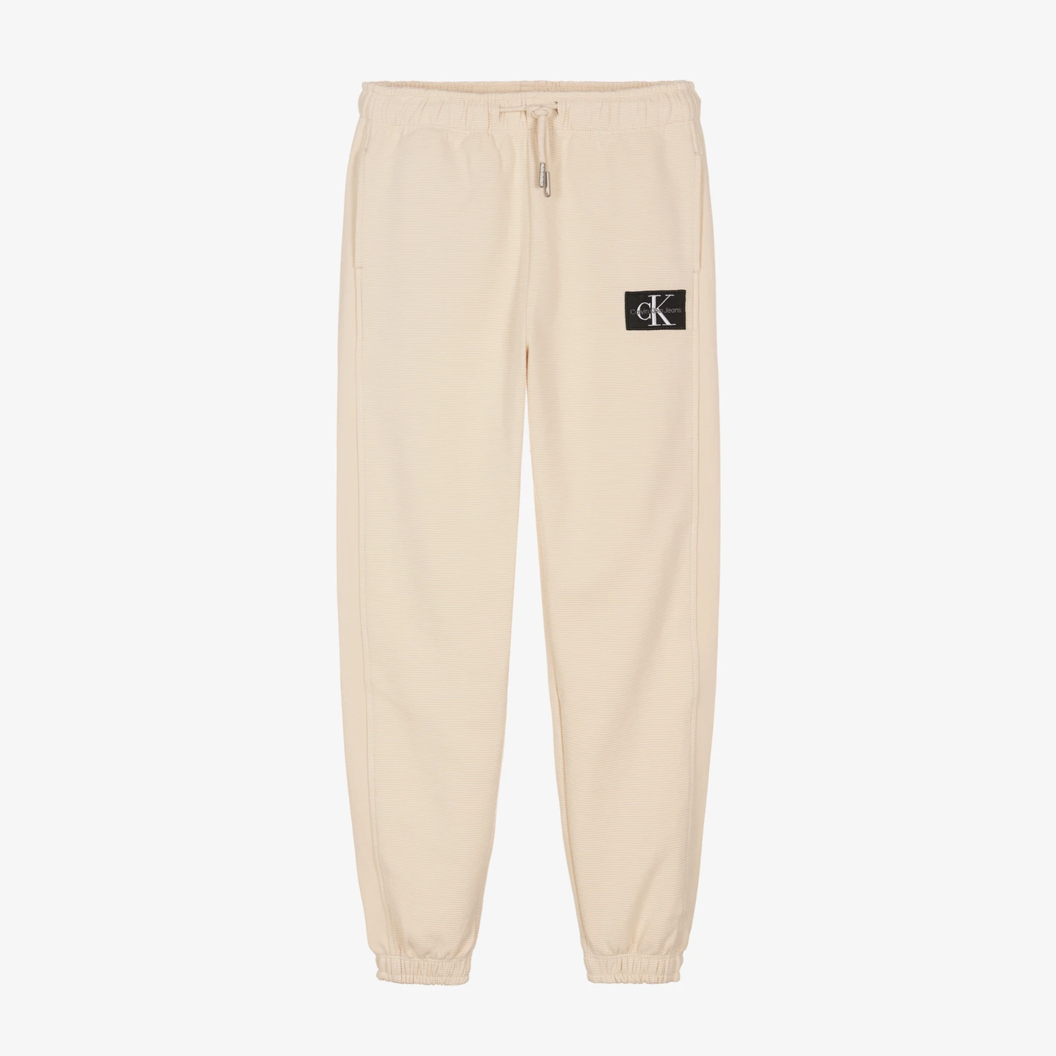 Casually stylish ivory cotton joggers for teen boys by Calvin Klein Jeans. Just right for relaxing in, they are ribbed and have useful concealed side pockets and an embroidered black and white logo badge on one leg. The waistband has a drawstring with silver logo end caps for a good fit. The main material of this product is made of at least 50% transitional cotton.