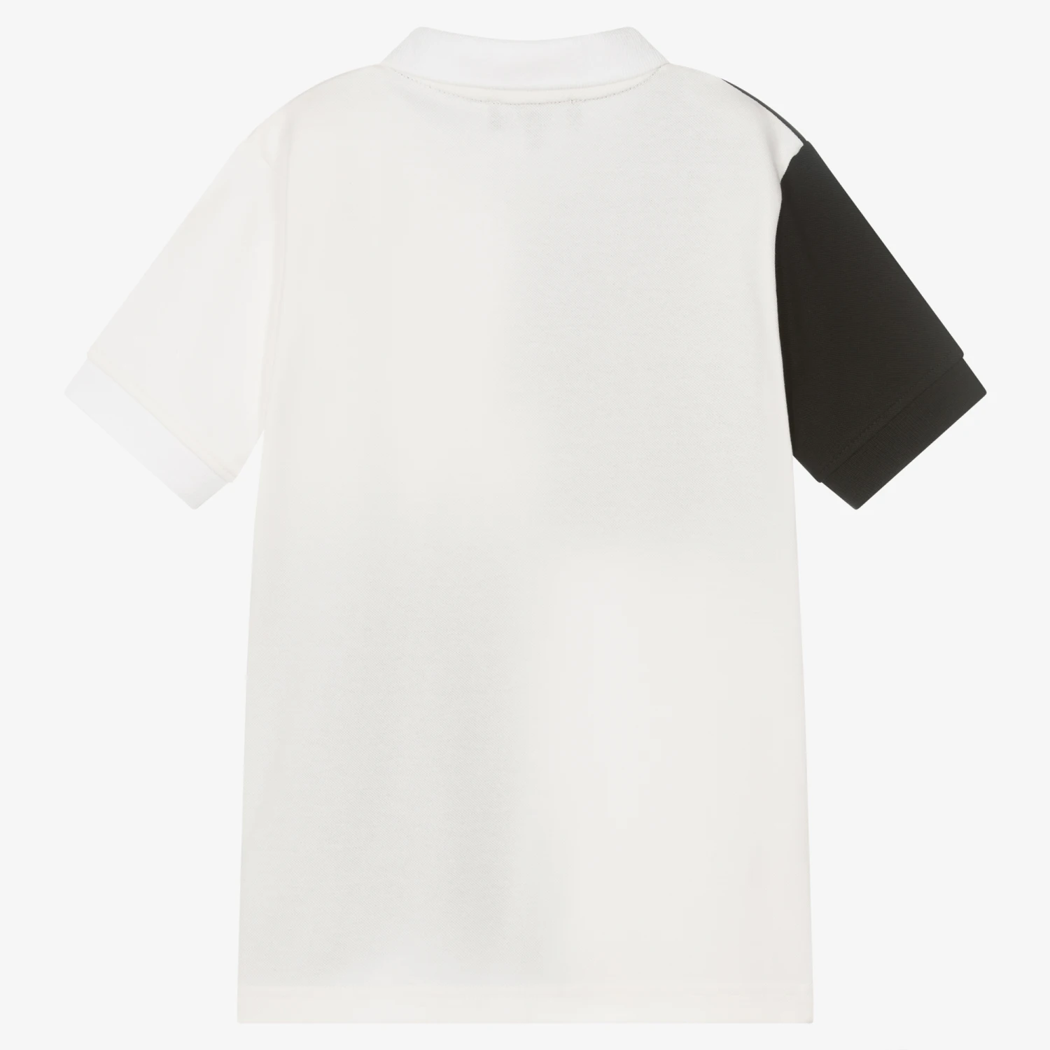 From iconic American brand DKNY, this teen boys white and black polo shirt is made from soft cotton piqué. It has a alternating quarter colour block design, with a partially visible logo print. A classic style, it has a button-up collar and ribbed trims.