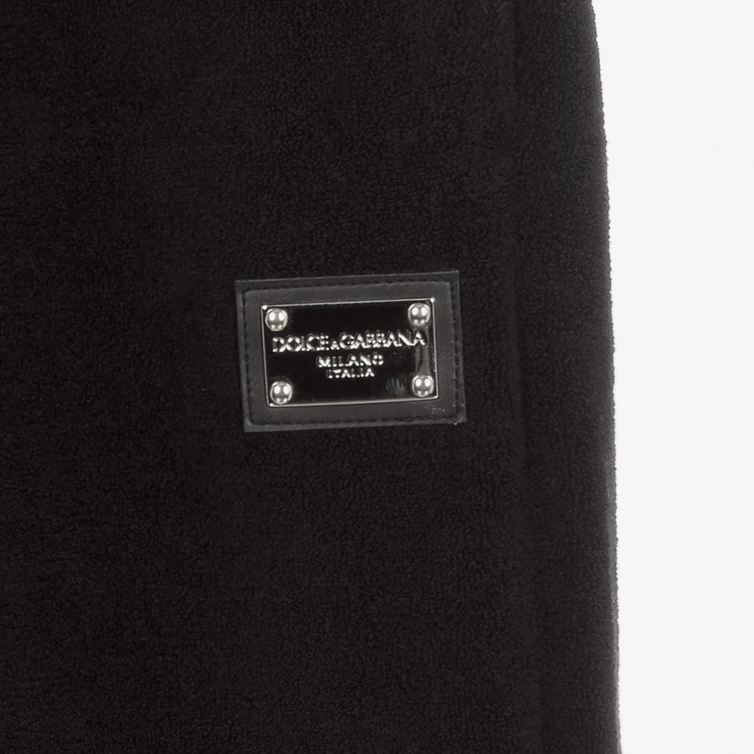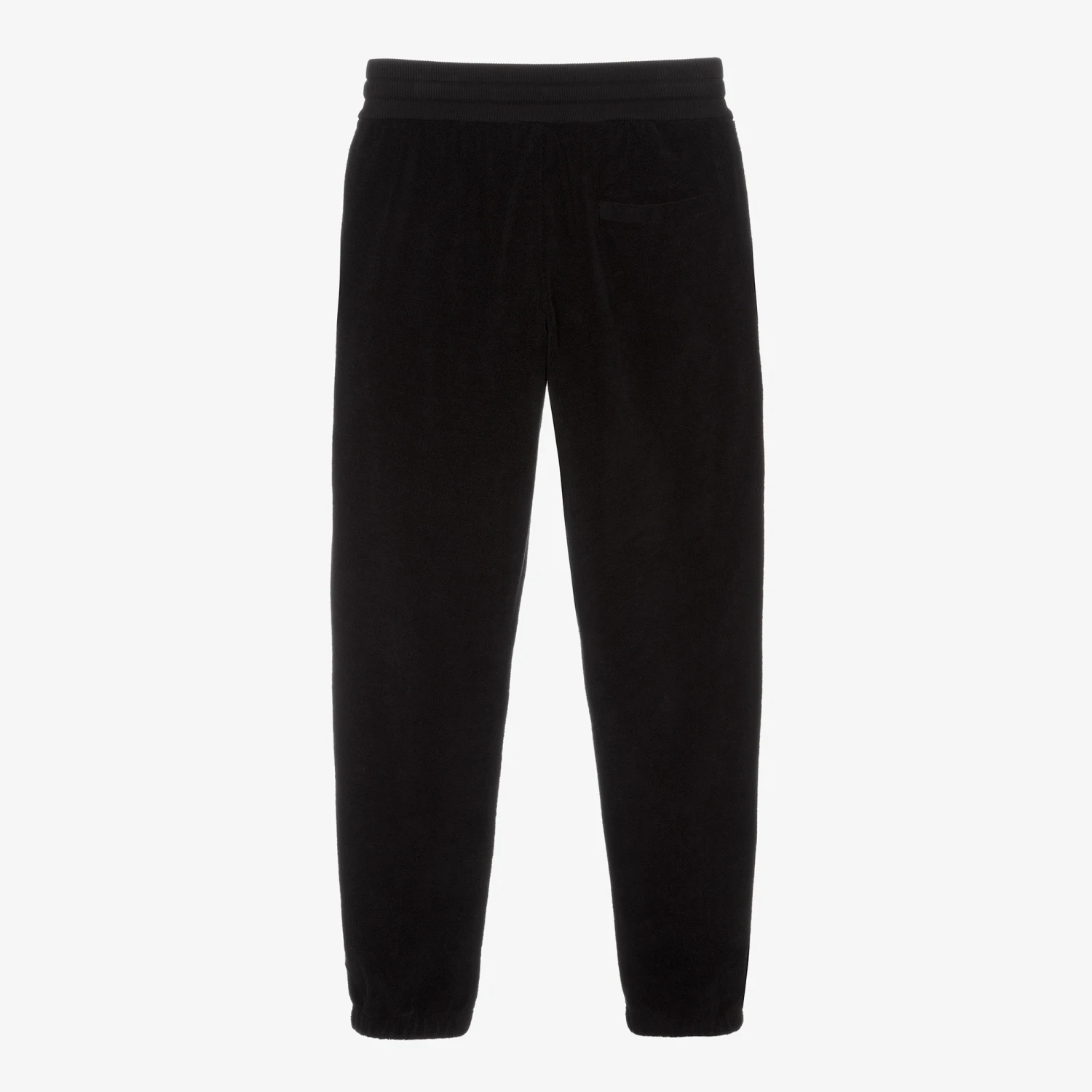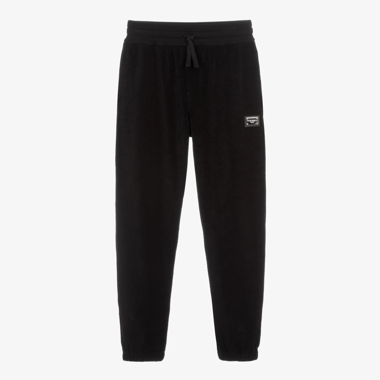 Black joggers for teen boys by Dolce & Gabbana, inspired by the luxury brand’s adult collection. In a cool oversized fit, they are made in soft terry cotton jersey for casual wear or just lounging. The signature silver metal and leather logo plate can be seen on one leg for added luxury element. Cuffed at the ankle for extra cosiness, they have a ribbed drawstring waistband, side seam pockets and a back pocket.