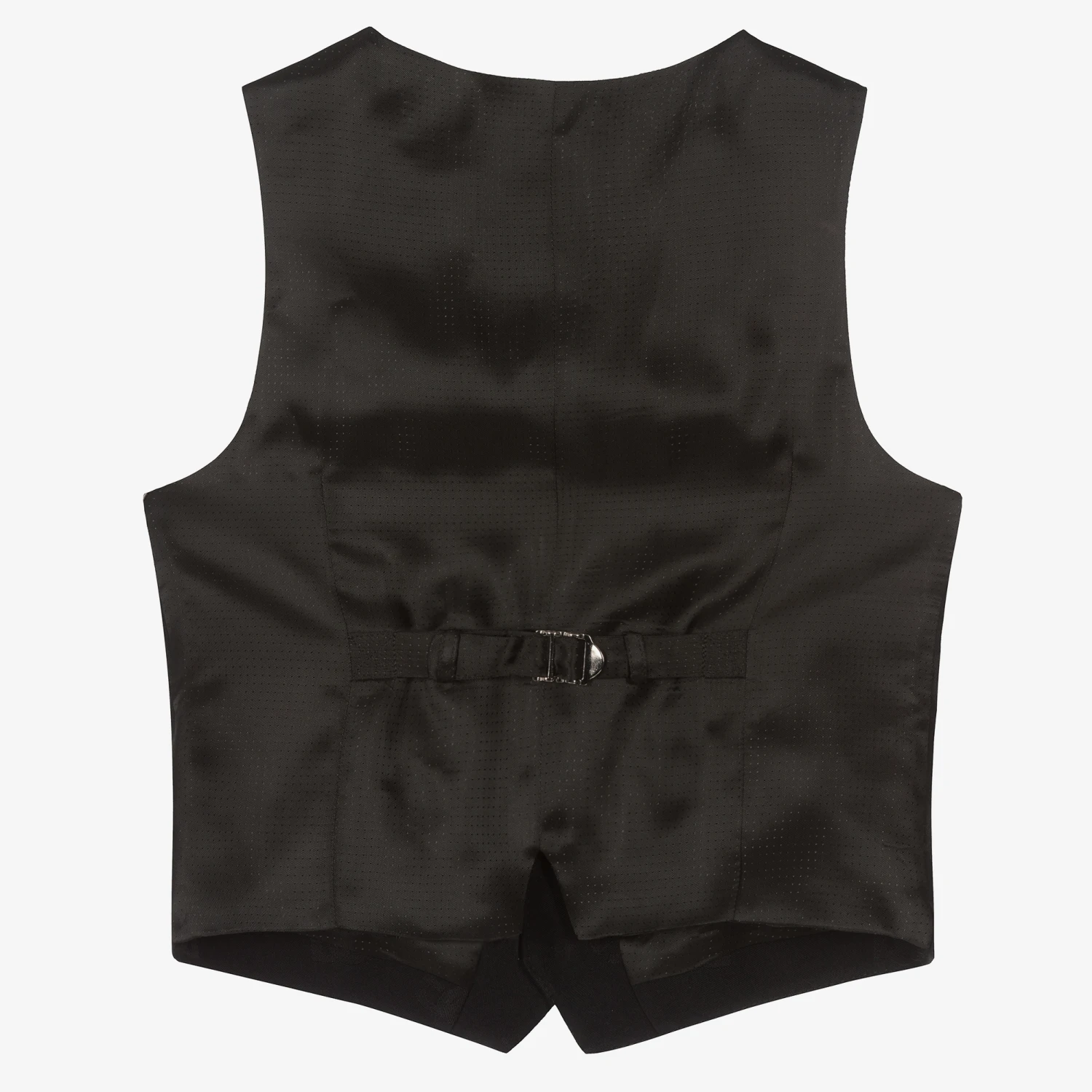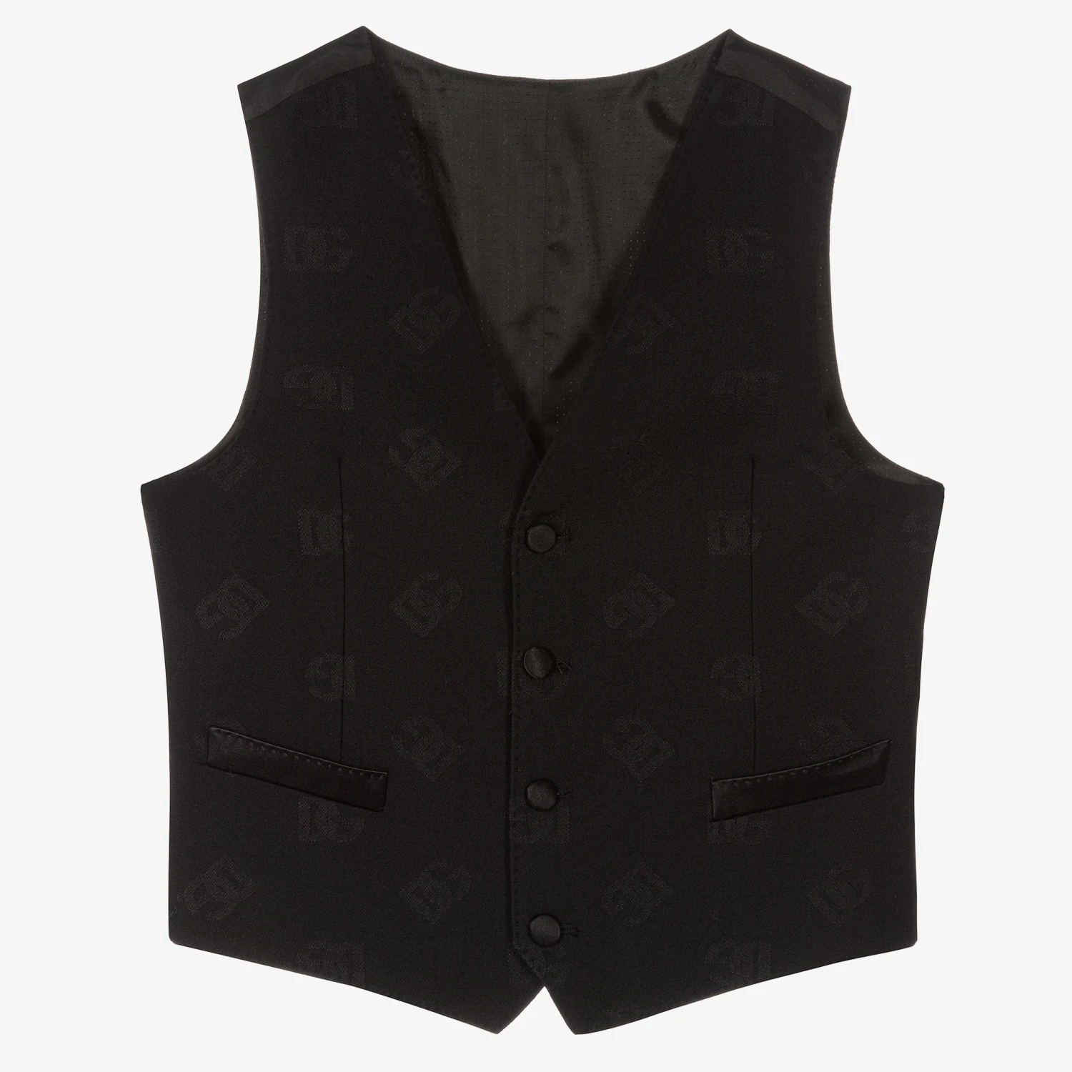Luxury wool blend waistcoat for teen boys by Dolce & Gabbana. The soft-feel fabric has a jacquard crossover DG logo pattern within the weave. There are fabric-covered buttons and faux pockets on the front with silky trims. The back has a silky fabric with a microdot pattern and a metal back adjuster.