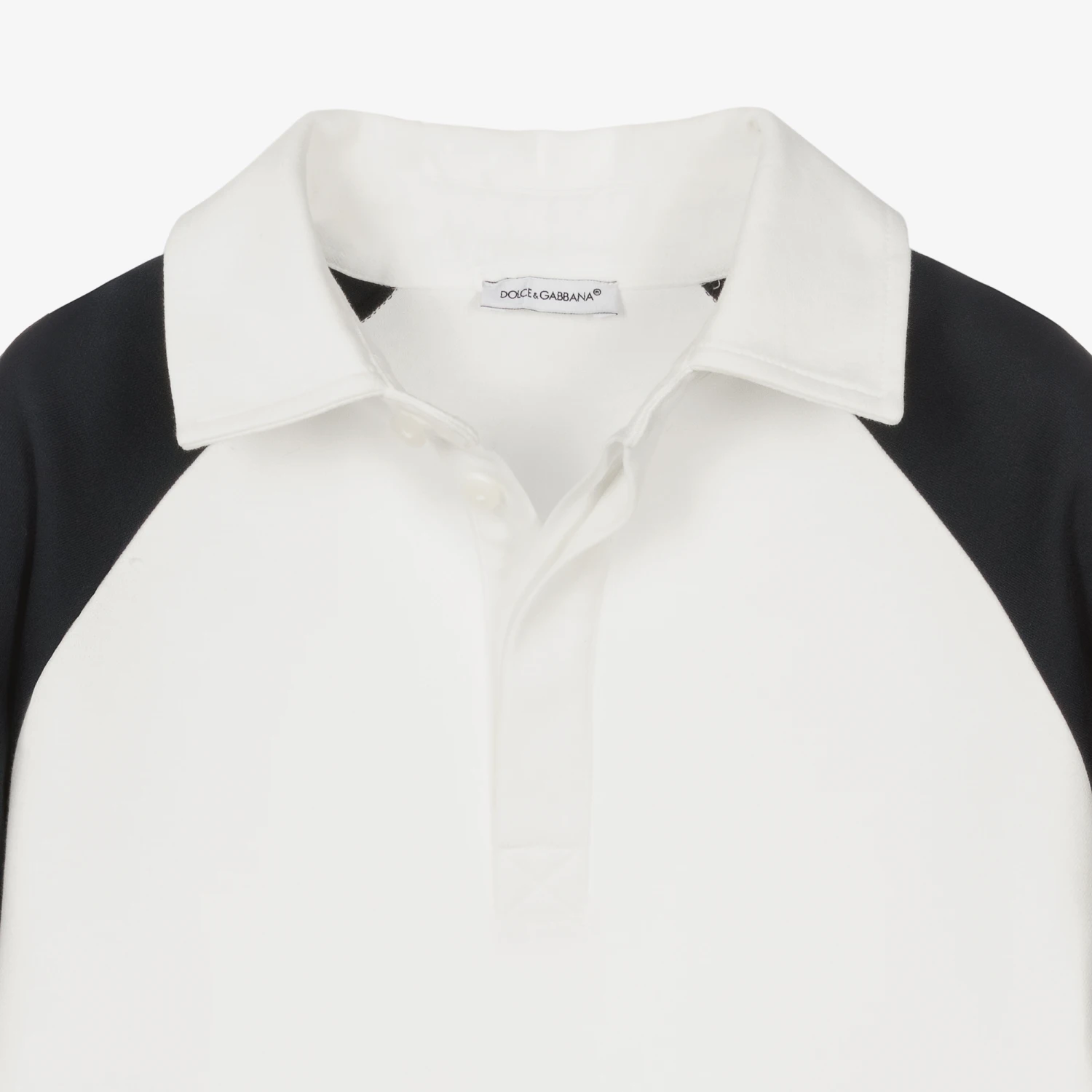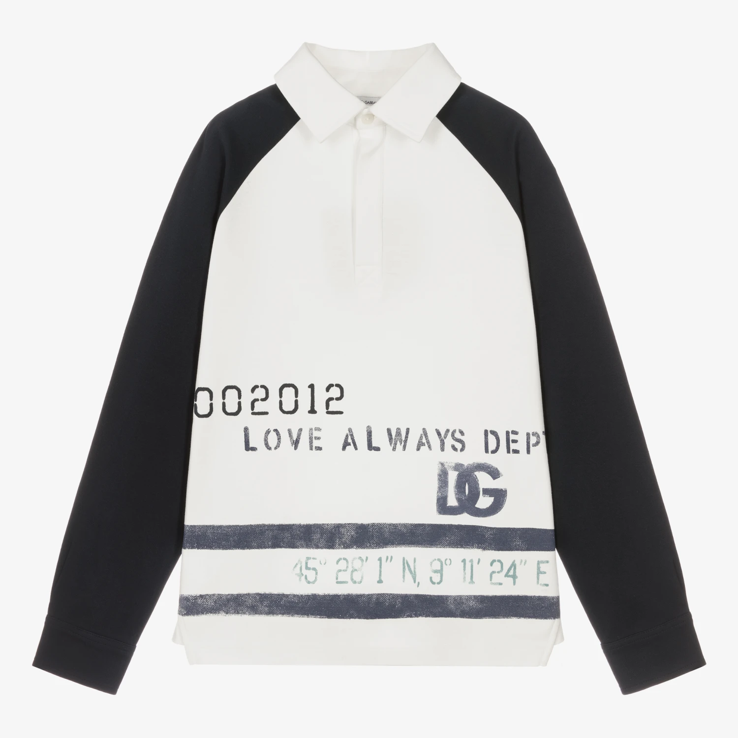 White and navy blue polo shirt for teen boys by Dolce & Gabbana, printed with the crossover DG logo and naval style writing. Nautically themed, this cool cotton top has a ribbed collar and branded front button fastenings.
