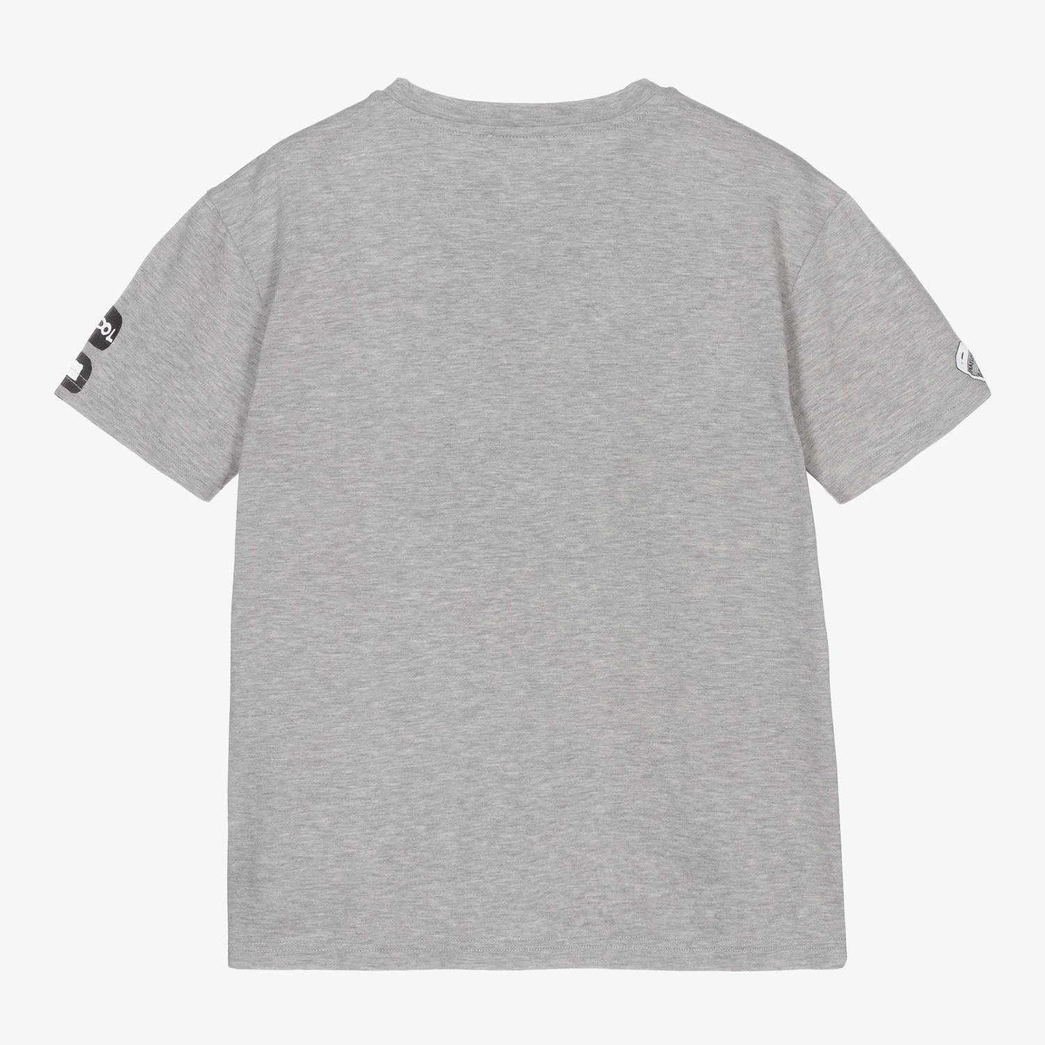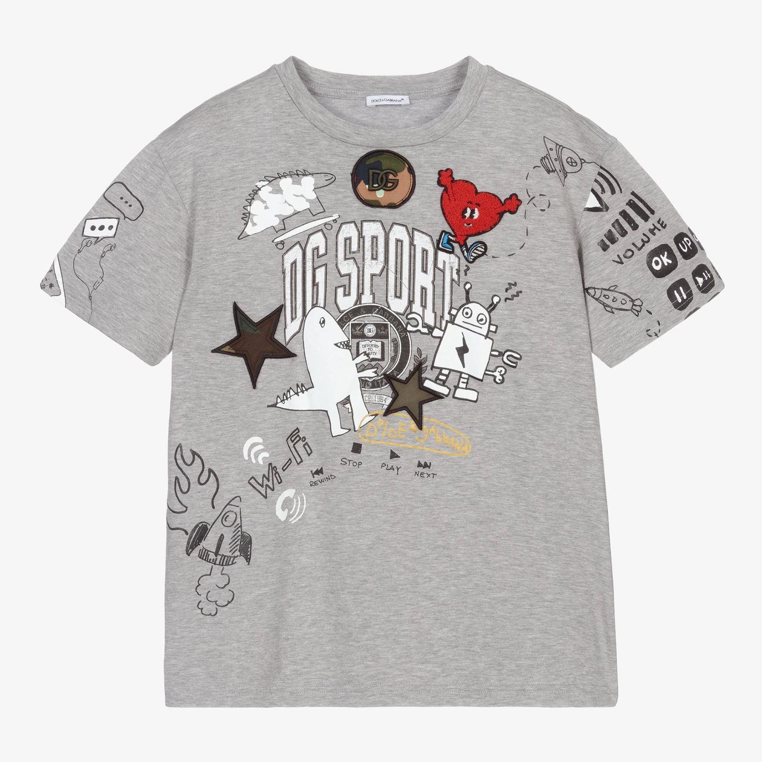 Grey marl T-shirt for teen boys, by luxury Italian designer Dolce & Gabbana, made in soft cotton jersey. Inspired by the main collection, it has a varsity-style DG Sport logo print on the chest, with graphic cartoon drawings, a fun red bouclé heart, and camouflage logo appliqués.