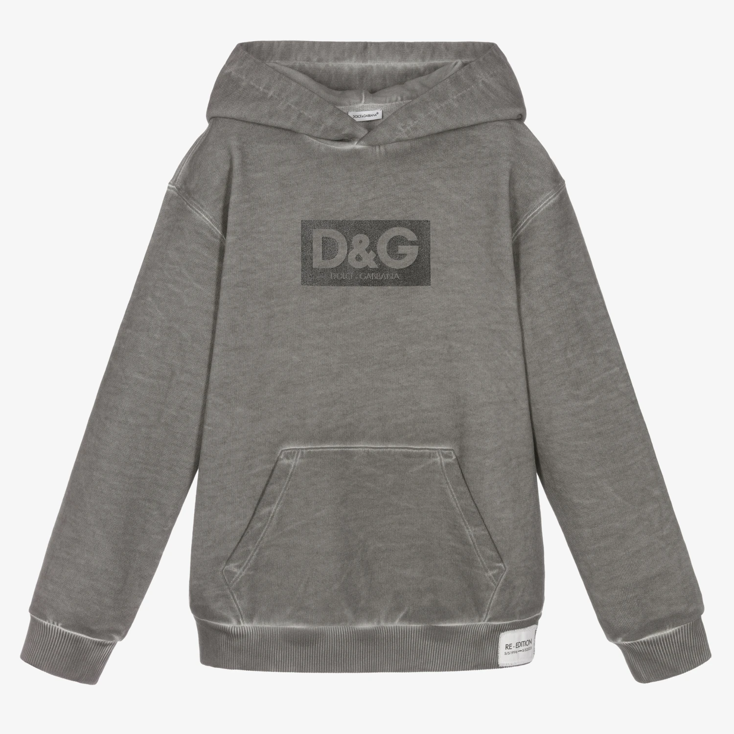 From luxury Italian brand Dolce & Gabbana and inspired by the main collection, a washed grey hoodie for teen boys in the designer’s 1996 style. This casual hoodie has a black D&G logo on the front for instant recognition and is finished with a white re-edition badge near the hem to solidify the 90s style. Made in soft mid-weight cotton jersey, this cool top is comfortable and easy-to-wear.