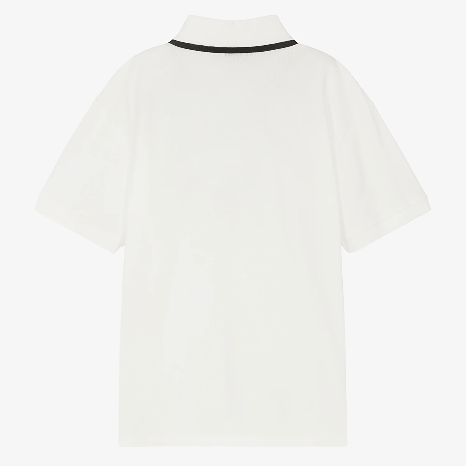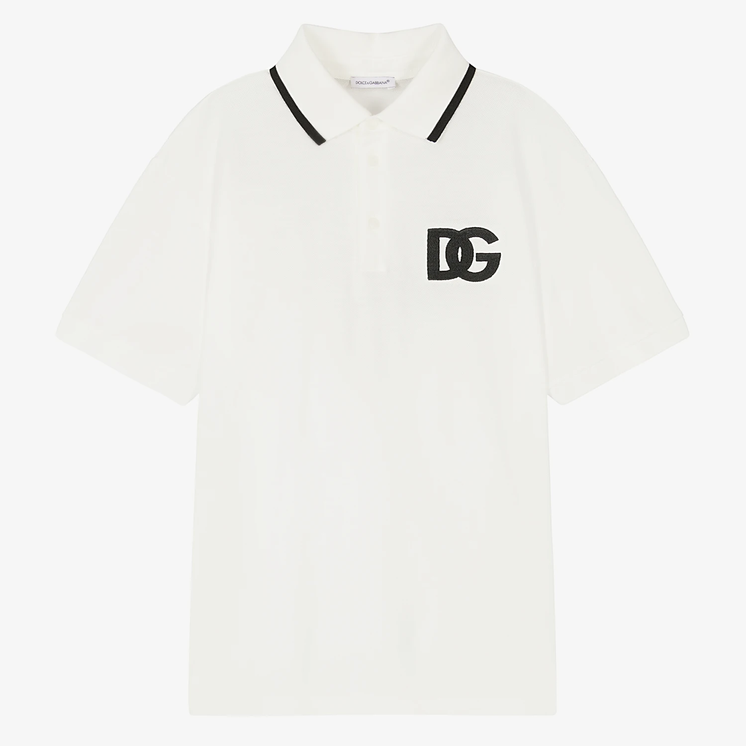 Teen boys off-white polo shirt by Italian brand Dolce & Gabbana. Embroidered with a black DG logo appliqué at the chest, there is a black tipped ribbed collar and branded button fastenings for subtle logo luxury. Casual and comfortable to wear, it is made in soft, lightweight cotton piqué.