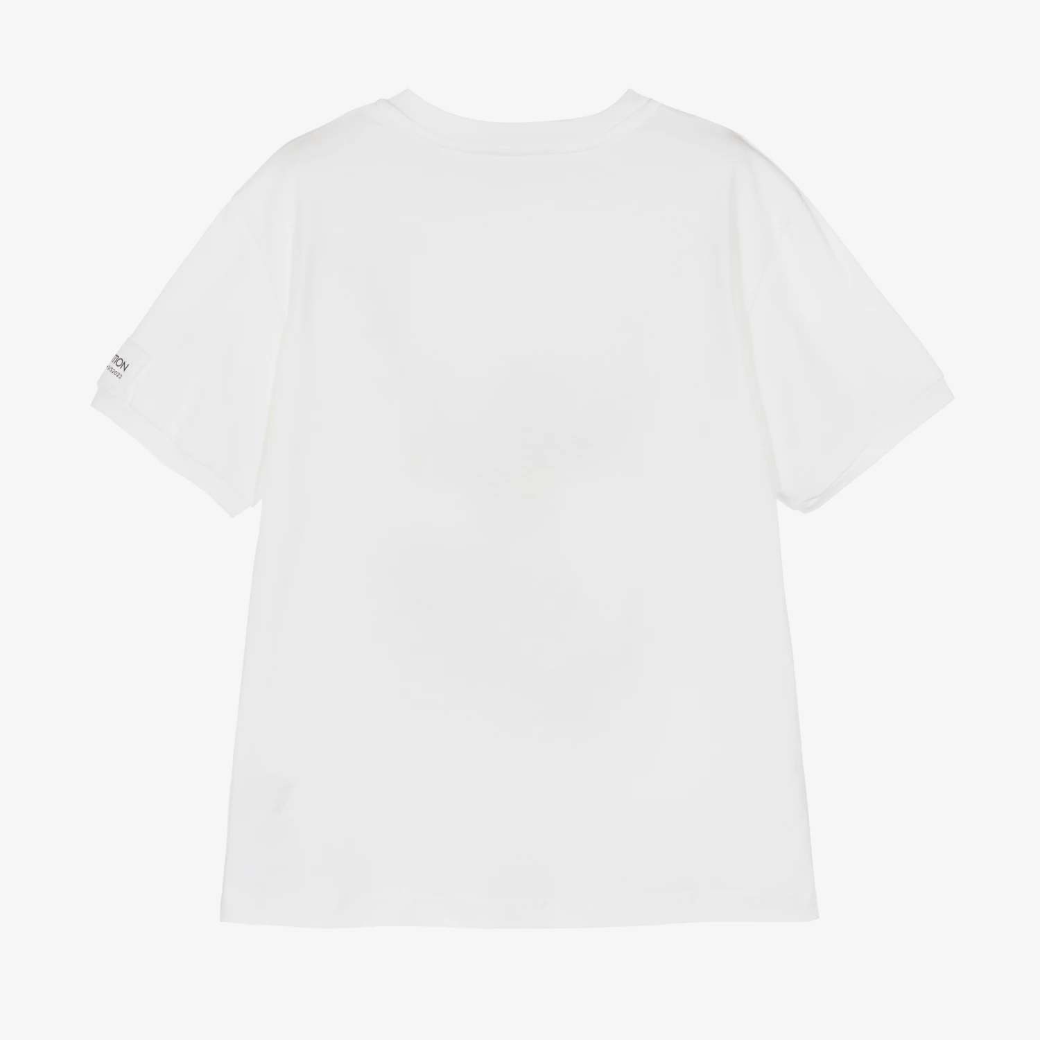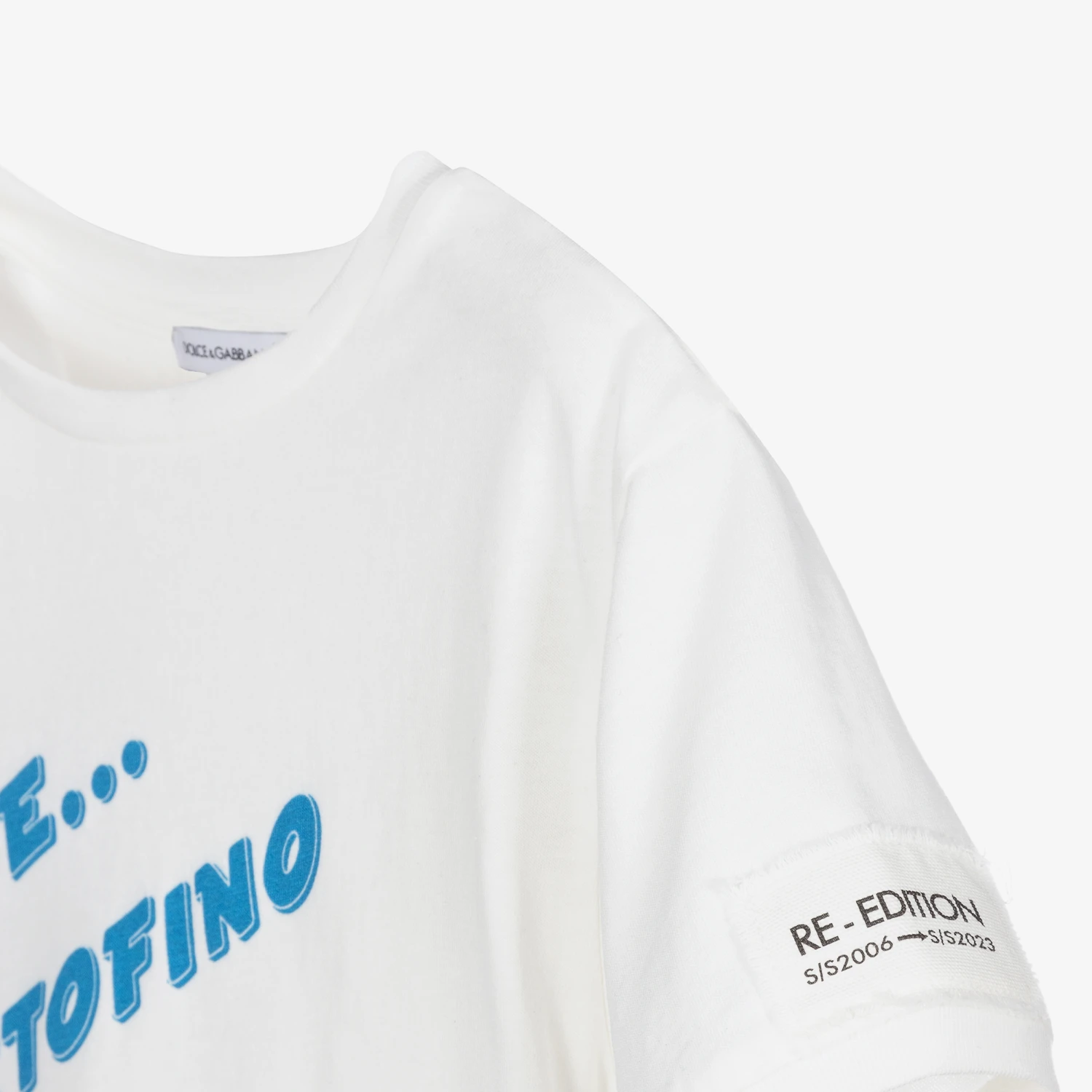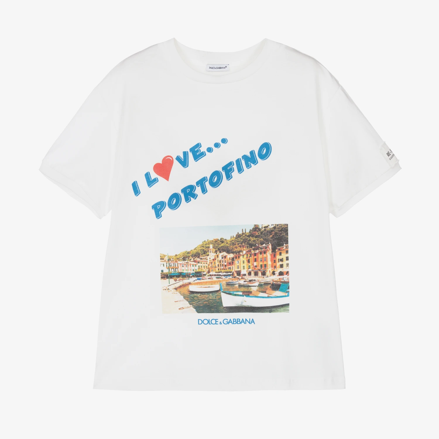 A white cotton T-shirt for teen boys from luxury brand Dolce & Gabbana, as seen in the main collection. Renowned for their vibrant graphics, the designer celebrates the brightly coloured homes of the Italian coastal village of Portofino, with an ironic ’00s-style postcard and retro lettering above. Drawing inspiration from archival pieces, the top has a Re-Edition canvas patch stitched on the sleeve, paying homage to the Spring/Summer 2006 collection.