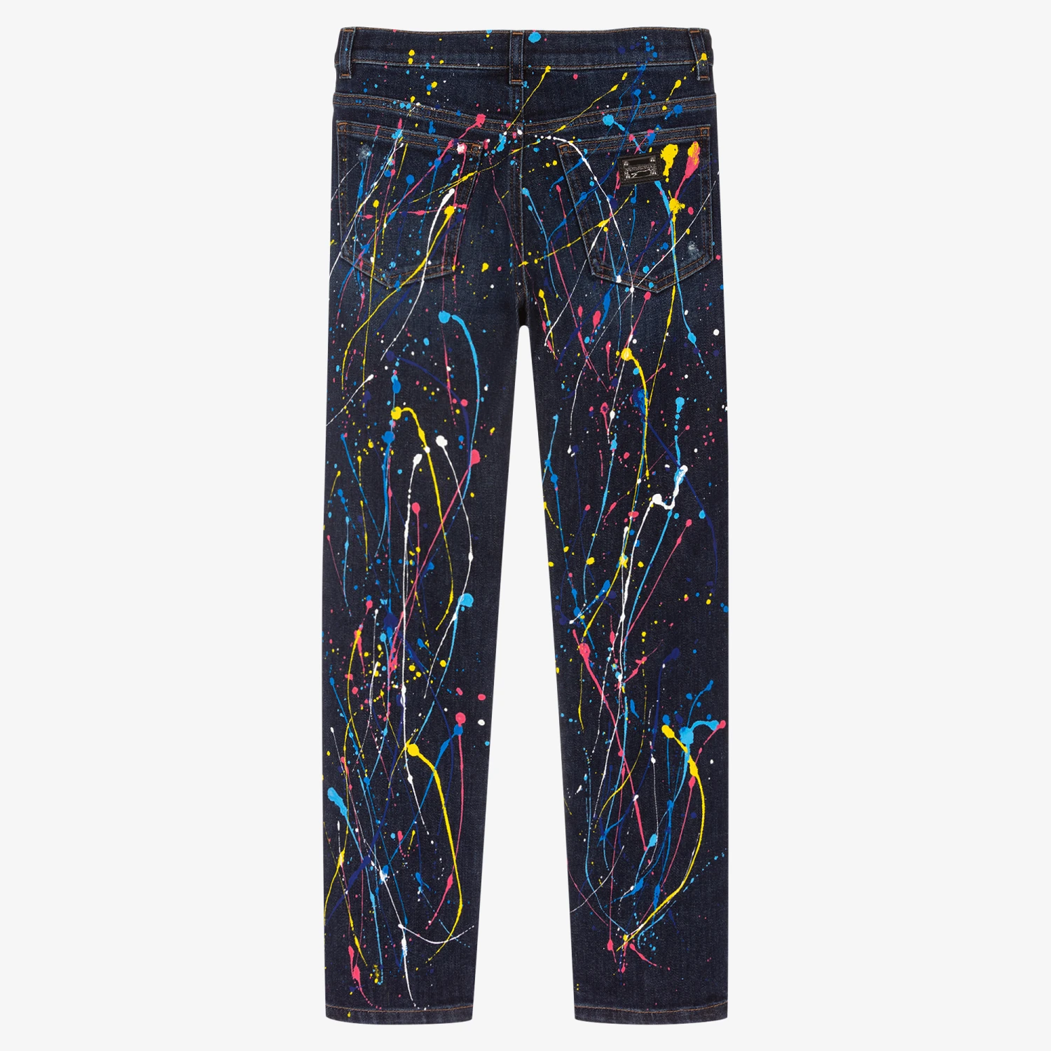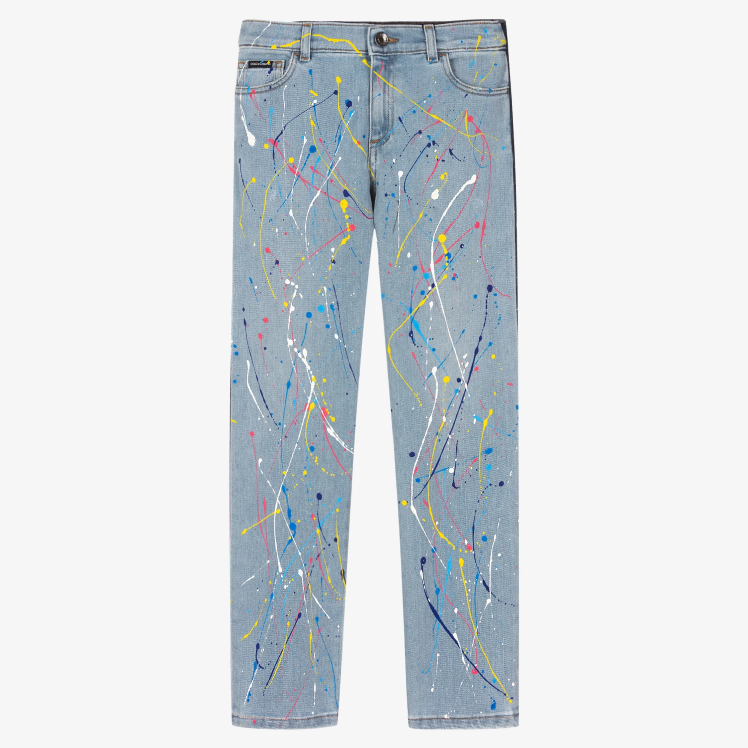 Teen boys two-tone blue denim jeans by luxury brand, Dolce & Gabbana, with a fun colour splash design. Inspired by the menswear collection, they are a typical five pocket style with a straight fit and mid-rise waist. There is a black logo tag stitched on the coin pocket and a leather and metal logo plate on the back.