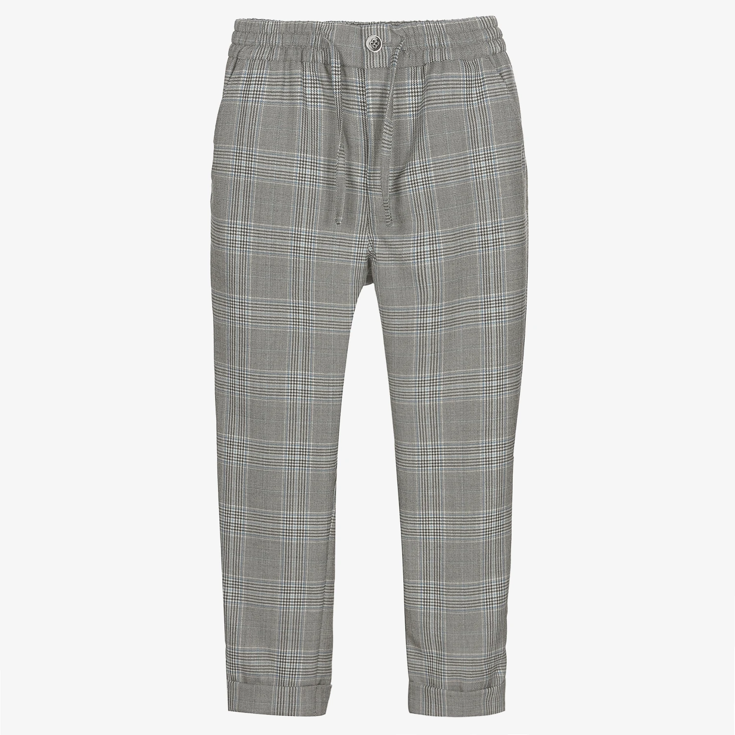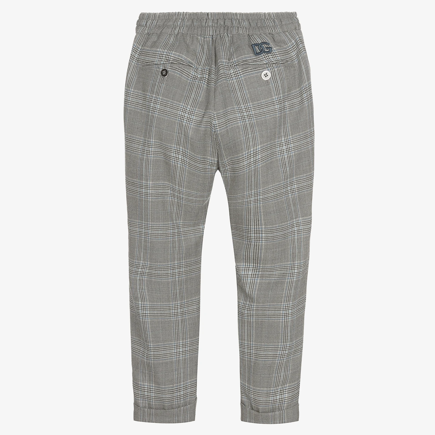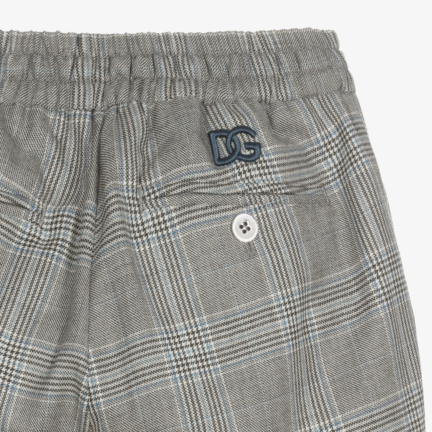 Smart grey trousers for teen boys by luxury Italian brand Dolce & Gabbana, woven from fine quality wool, with a silky satin lining. In a blue and grey Prince of Wales check, they have a crossover DG logo embroidered in blue on one of the back pockets. There is an elasticated drawstring waistband, with a button and zip fastening, as well as slanted front pockets and turn-up hems.