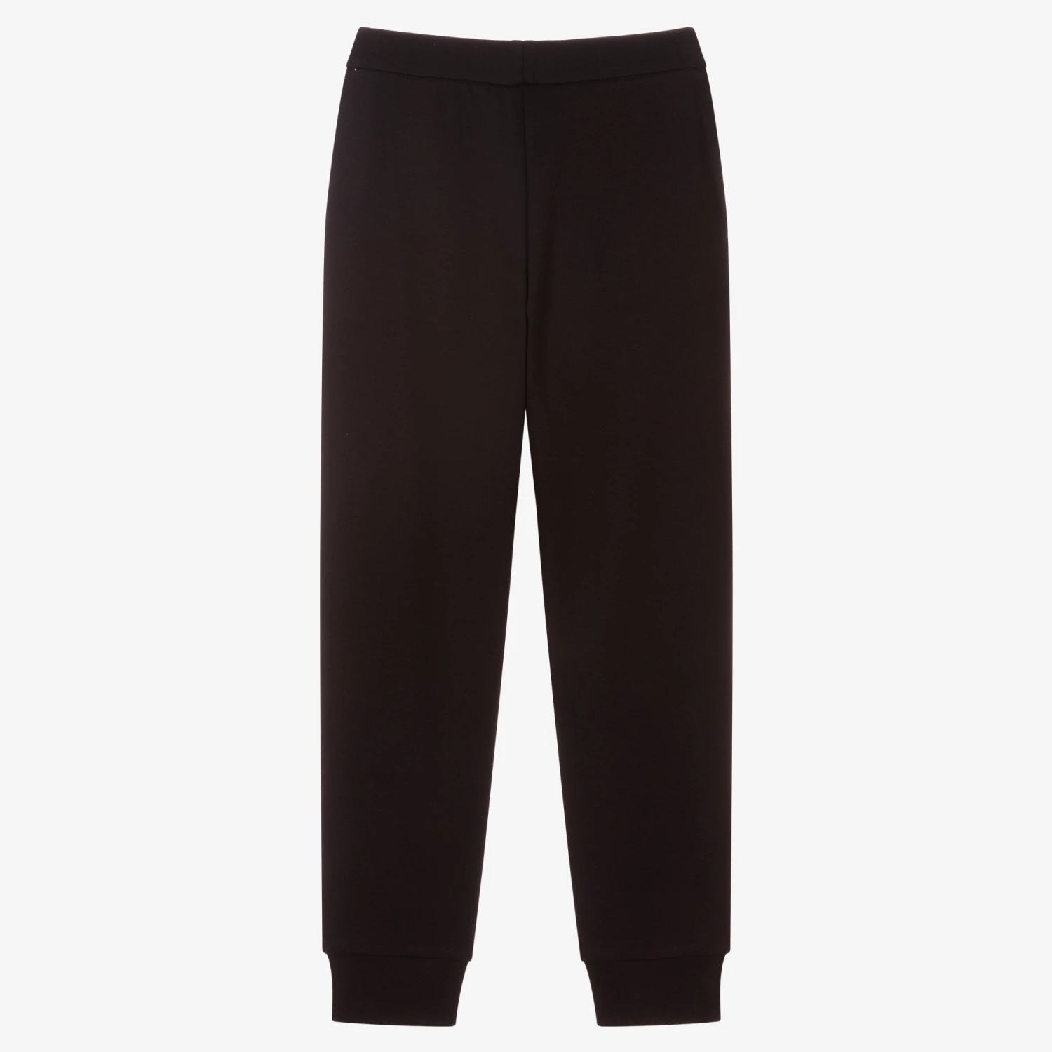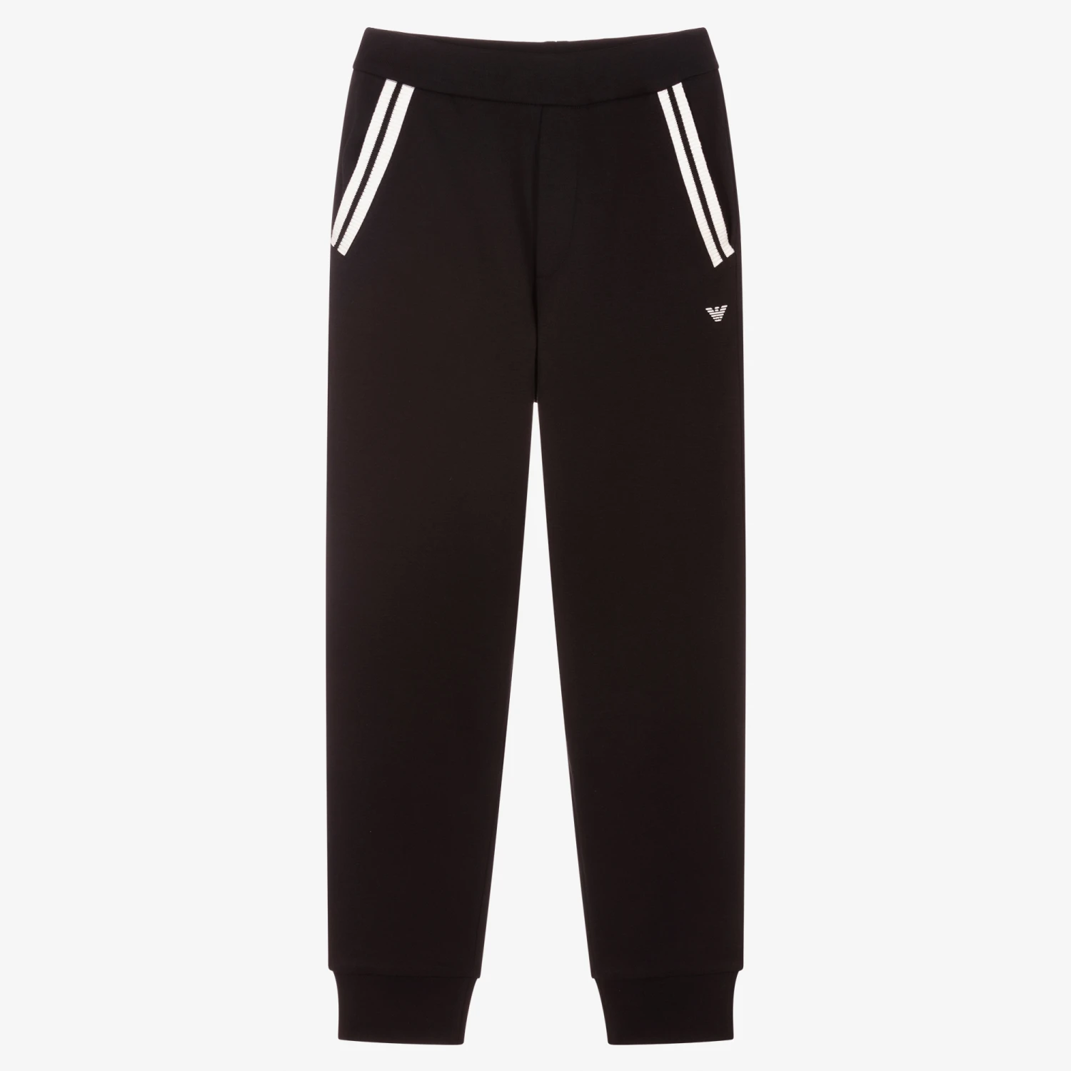 Teen boys black cuffed joggers by Emporio Armani, made in soft cotton sweatshirt jersey. With sporty white striped trims, they have the classic Eagle logo rubberised on one leg in white, and jetted front pockets.