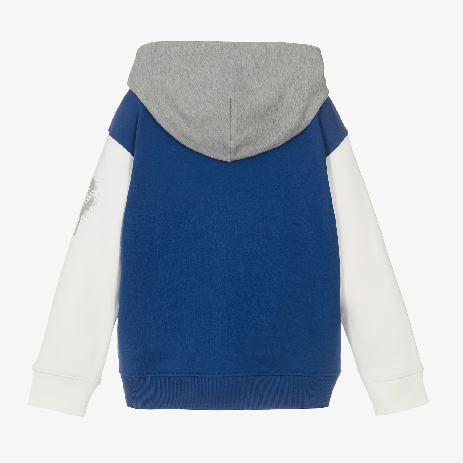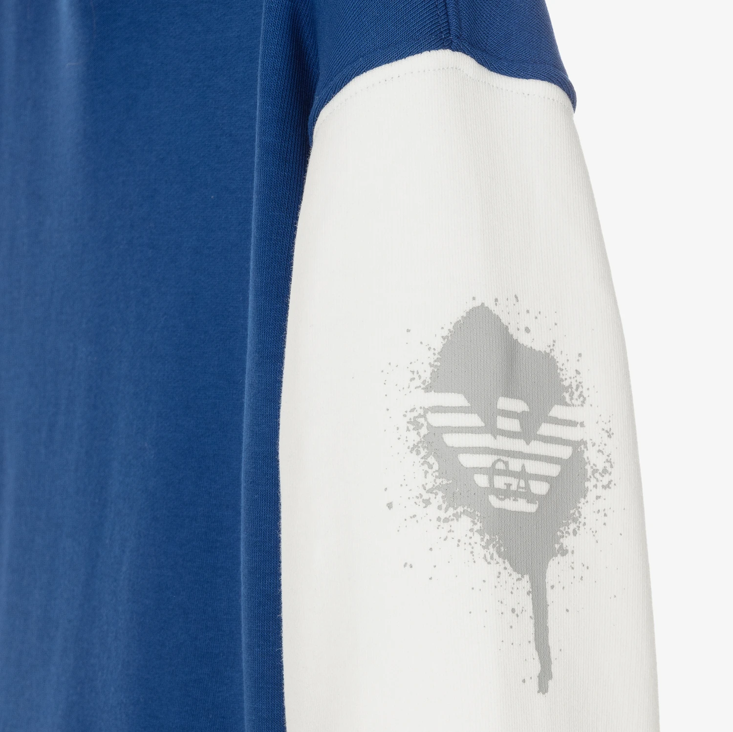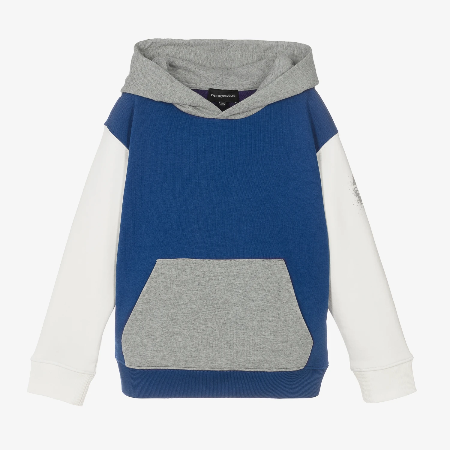 From Emporio Armani, a colourblock hoodie for teen boys, in royal blue, ivory and grey. Casual and comfortable, it is made in cotton-blend sweatshirt jersey with a pouch pocket on the front and a grey Eagle logo splash print on one sleeve.