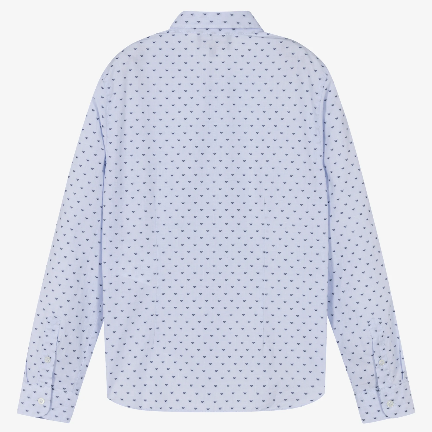 Pale blue smart casual shirt for teen boys by Emporio Armani. Unmistakably Armani, the designer’s Eagle logo can be found all-over as a navy blue repeat pattern. Made in soft cotton poplin, it fastens easily with branded buttons on the front and cuffs.