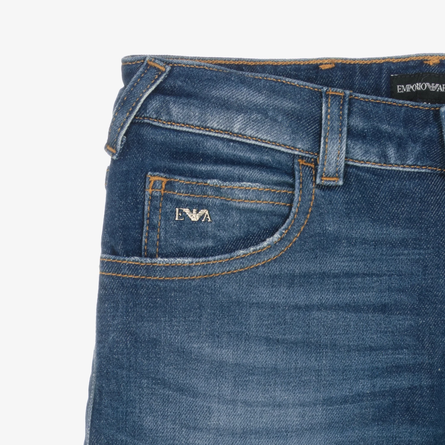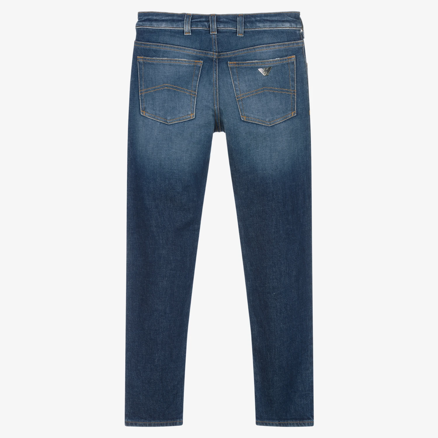 From Emporio Armani, blue denim jeans for teen boys with the brand’s signature Eagle logo as metalwork on the front and back. These stylish jeans have faded detailing for a contemporary look and fasten with a branded button and zip fastening on the front for an added designer touch.