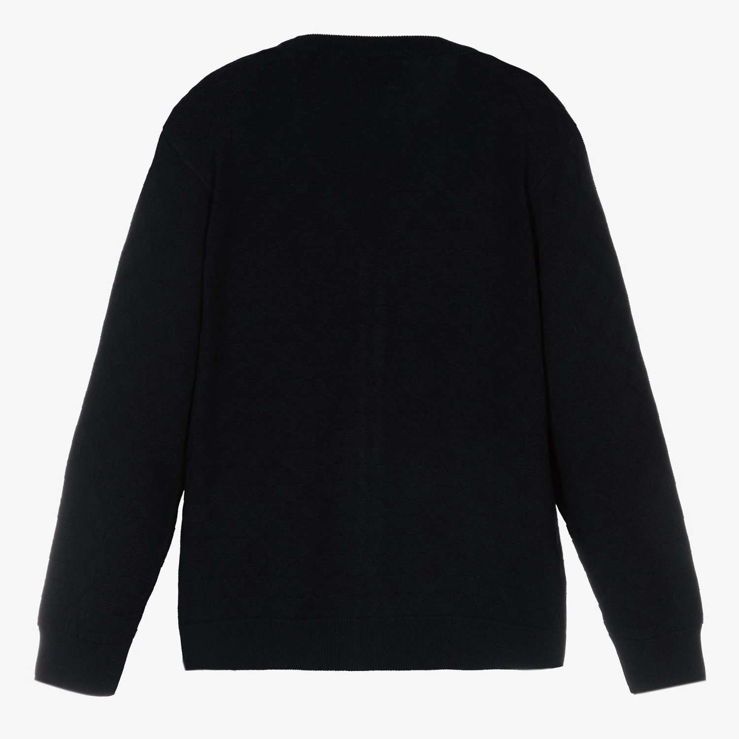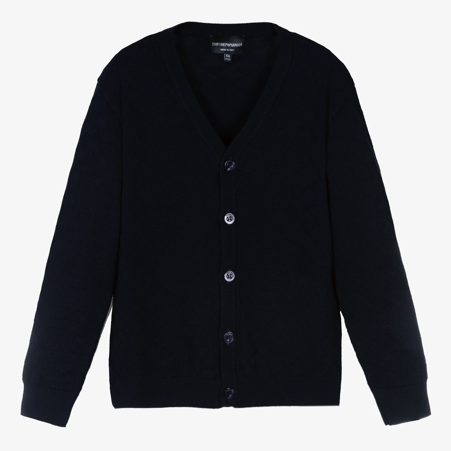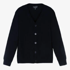 From Emporio Armani, intarsia Eagle logo knitted navy blue cardigan for teen boys. It is stylish with a V-neck, ribbed trims, and branded button fastening on the front whilst the soft knit is comfortable and ideal for layering.