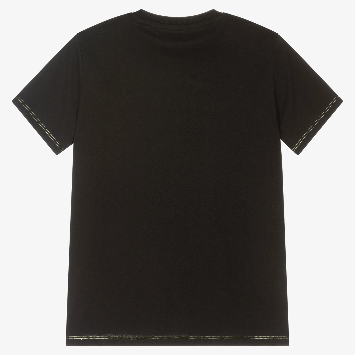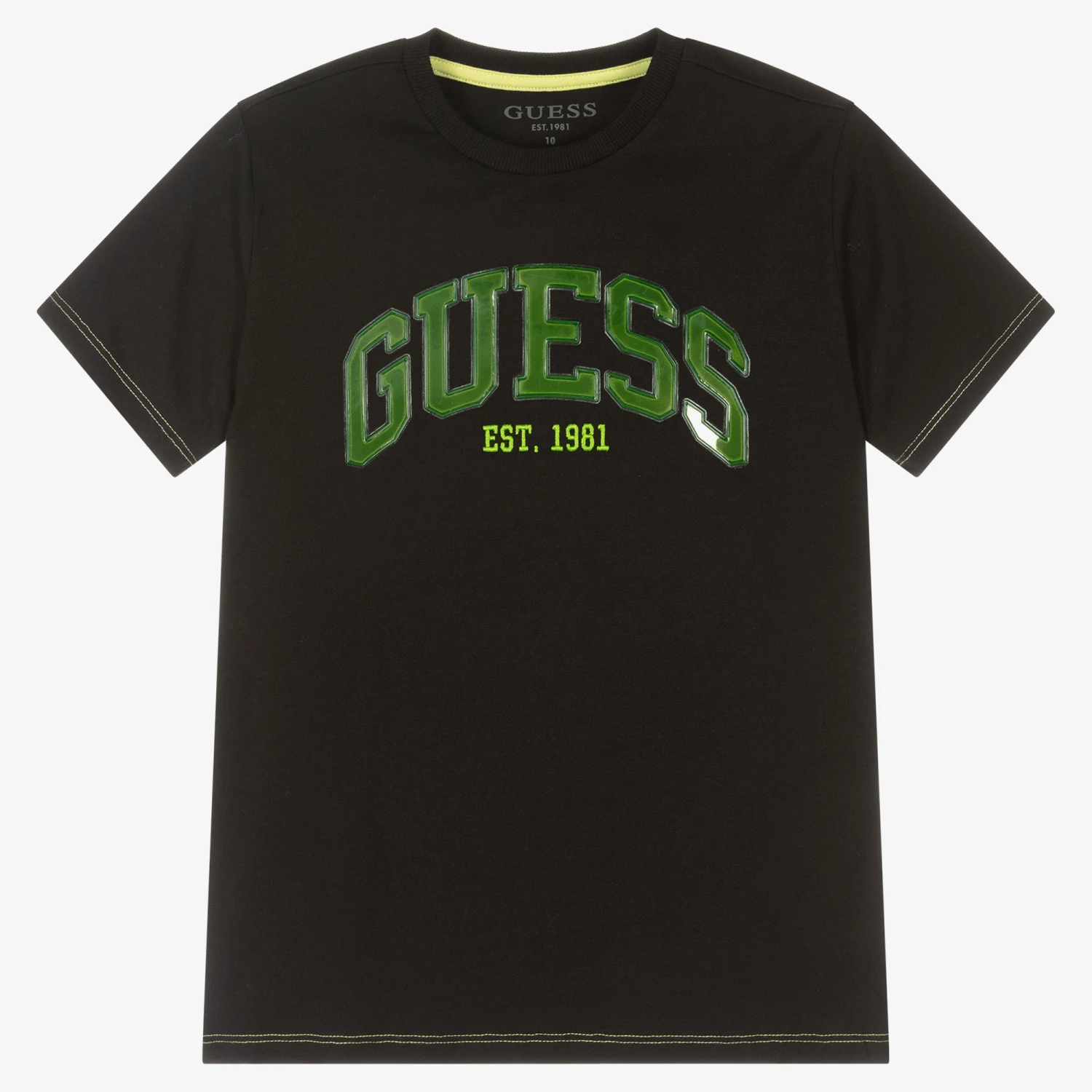 Black T-shirt for teen boys by American label Guess, with the designer’s shiny, rubberised green logo on the front. Made in soft cotton jersey, this casual, versatile tee has lime green overstitching on the cuffs and hem and a gently ribbed crew neck. This T-shirt contains in-conversion cotton fibre.
