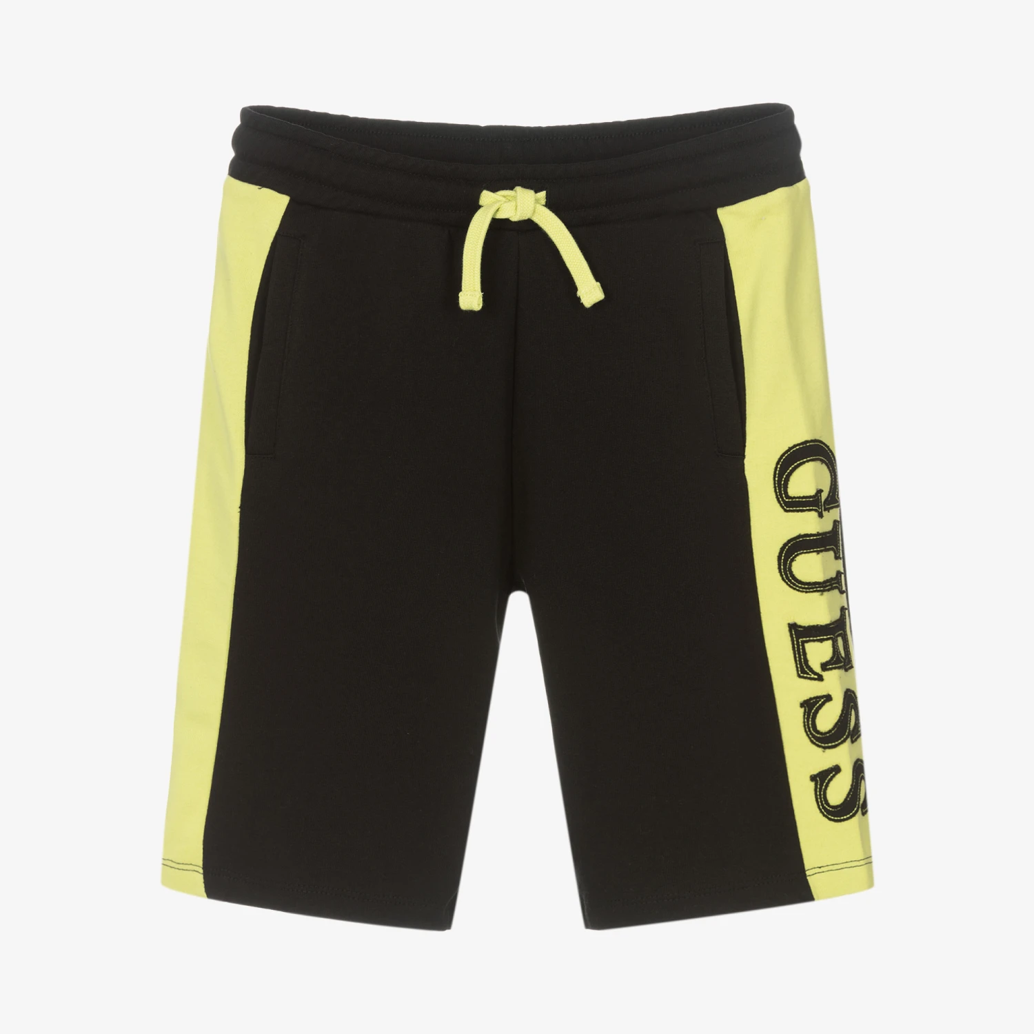 Black colourblock shorts for teen boys by Guess. They are made in super-comfortable cotton, with pale green side panels and the designer’s logo appliqué in a cool vintage effect. The waist is elasticated with a green drawstring for a great fit, and there are two handy pockets on the front, and one on the back.