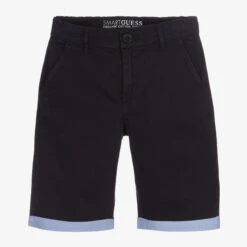 Navy blue Bermuda shorts for teen boys by Guess, made in soft cotton. Embroidered with a discreet tonal logo on the back, they have stylish turned-up hems in pale blue Oxford cotton. They fasten simply with a button and zip fastens, and have four smart pockets. This garment contains organic cotton fibres.