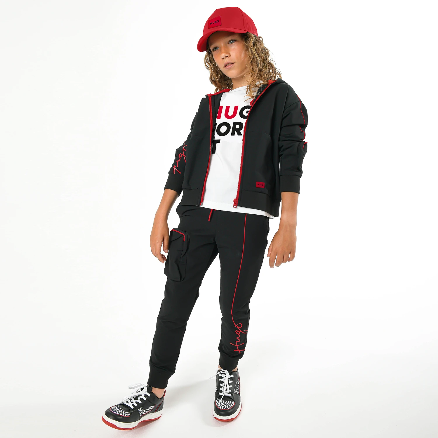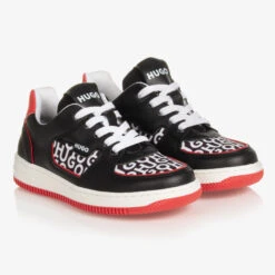 From HUGO, black trainers with multiple logo prints for teen boys. Detailed with red and white for an eye-catching contrast, these cool trainers are made in durable faux leather with logo-printed textile panels for instant brand recognition. With a non-slip rubber sole and lace fastenings, they are comfortable and stylish.