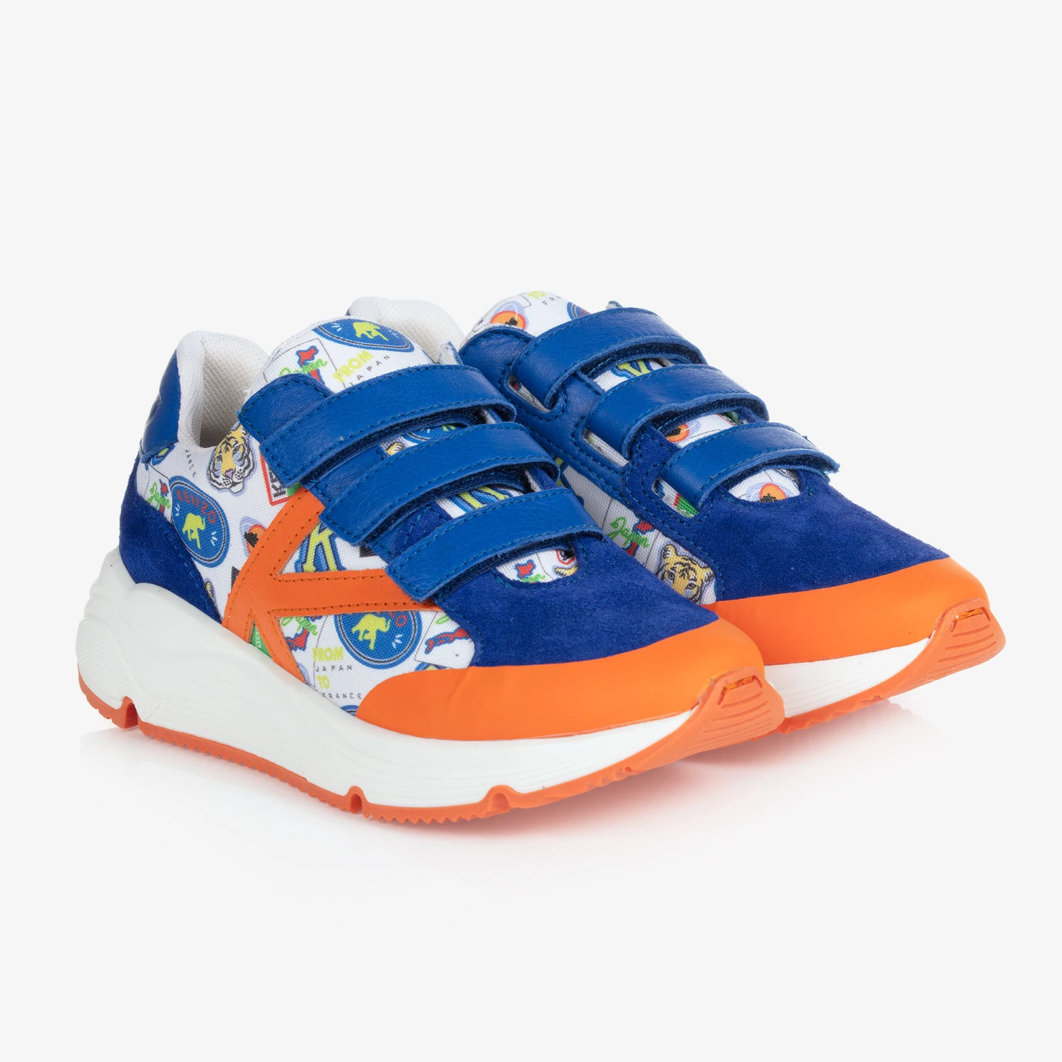 Vibrant blue and orange velcro trainers for teen boys and girls from KENZO KIDS. From the brand’s Journey collection, these bold trainers have colourful panels patterned in contemporary, travel-themed badges. There is an embossed logo on the heel and a ‘K’ patch on one side for further brand recogntion. A mix of supple leather, soft suede and durable canvas, these iconic shoes are finished with a cushioned insole and a chunky non-slip rubber sole.