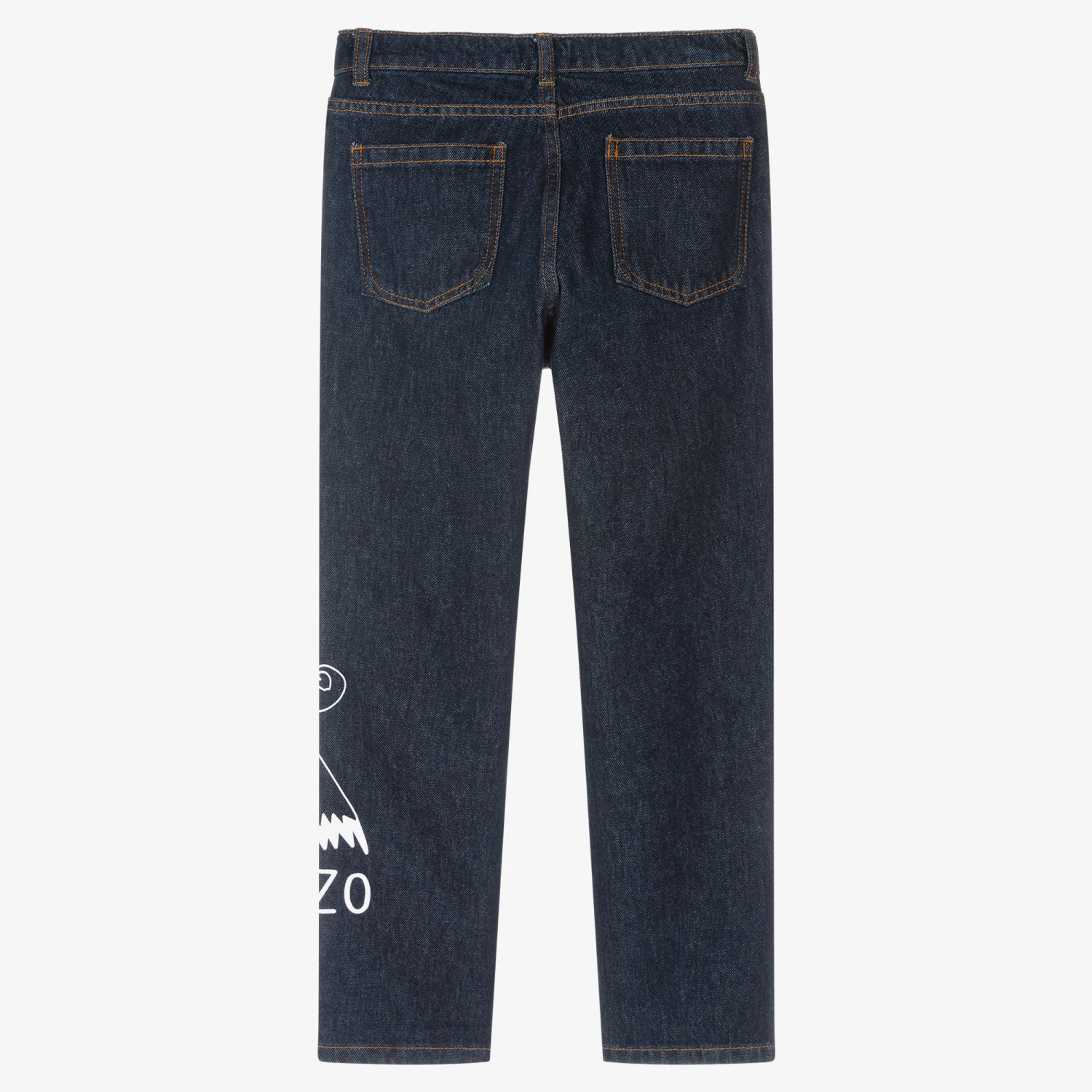 Dark blue straight jeans for teen boys from KENZO KIDS, instantly recognisable with the brand’s white logo on one leg. Made in soft, mid-weight denim, these logo-inspired jeans feature a logo ring attached to a belt loop and embossed silver hardware. In a classic five-pocket style, these timeless jeans fasten securely with a popper and zip.