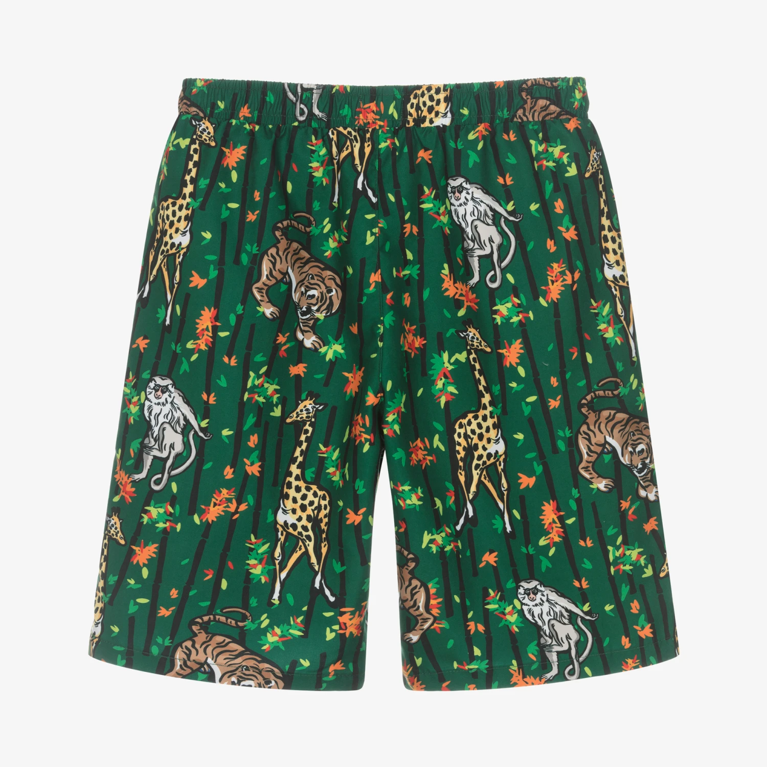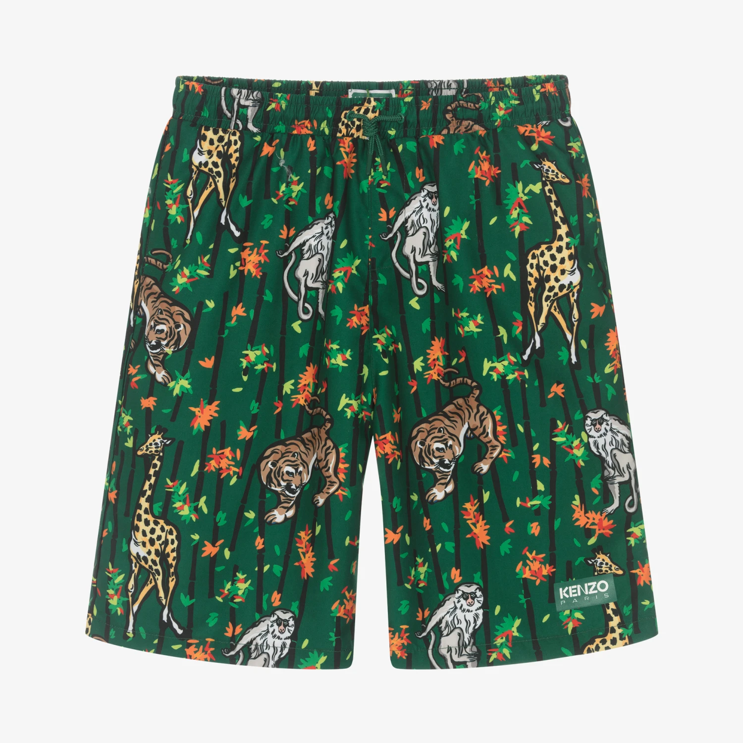 From KENZO KIDS, a pair of green swim shorts for teen boys, in the brand’s vibrant bamboo jungle pattern with monkeys, tigers and giraffes. Silky smooth and lightweight, they have a soft mesh lining and a drawstring waist for an adjustable fit. Concealed mesh-lined pockets are an added feature on the side seams.