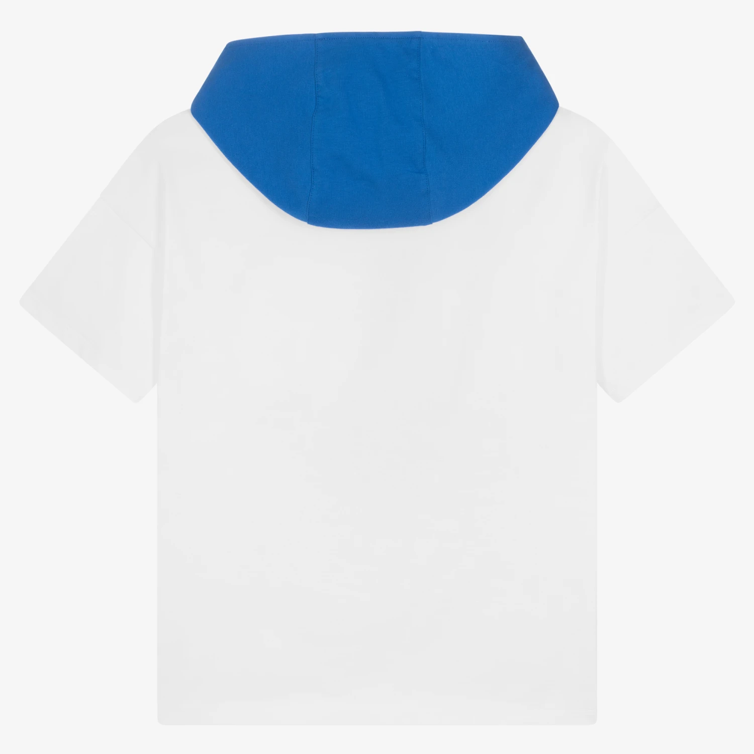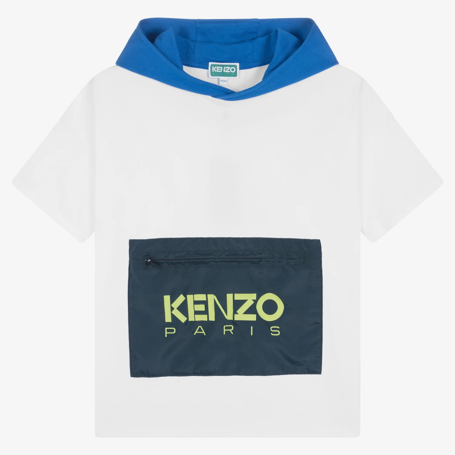 Teen boys white and blue hooded T-shirt from French brand KENZO KIDS. A classic design with unexpected elements, this cool sporty T-shirt is made in soft and stretchy cotton jersey, with a navy blue branded nylon pocket on the front and a royal blue hood for a multi-textural finish. It has a relaxed cut and dropped shoulders for a skater-style look.