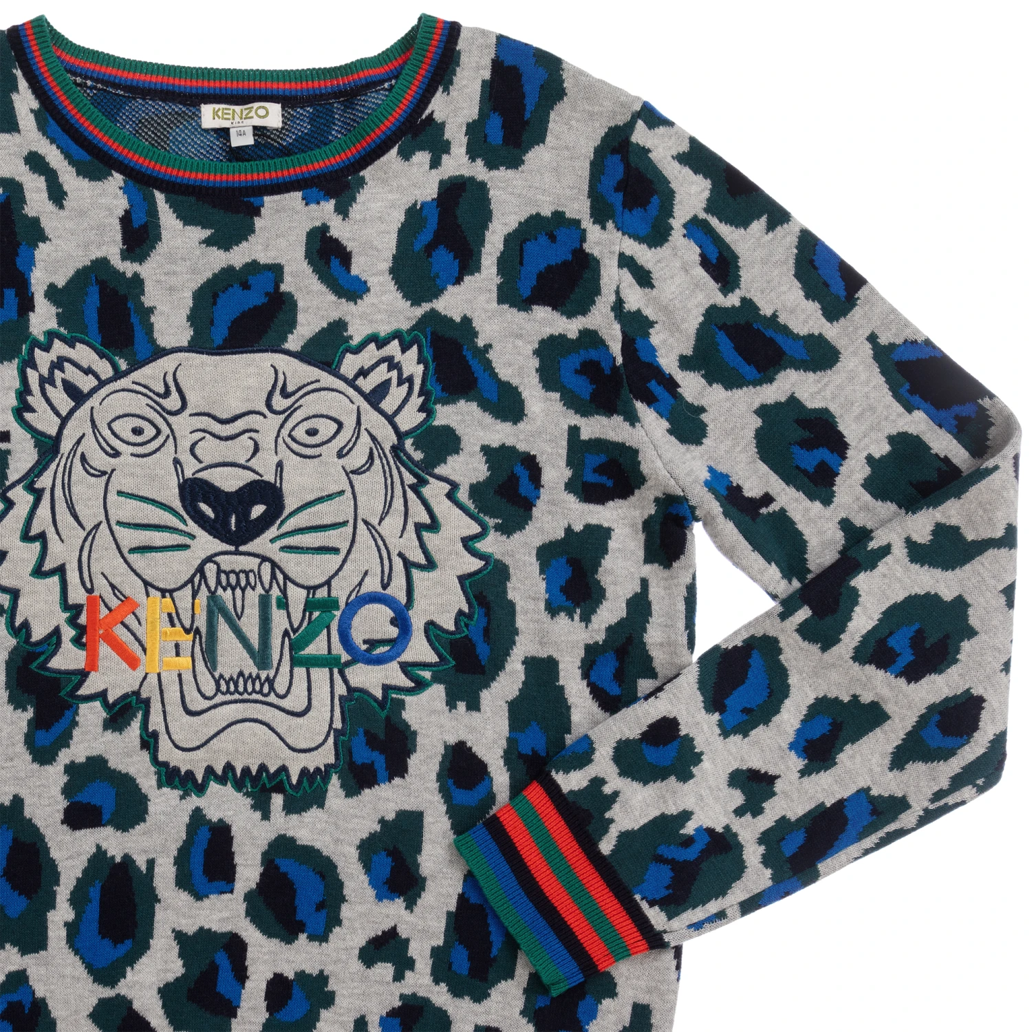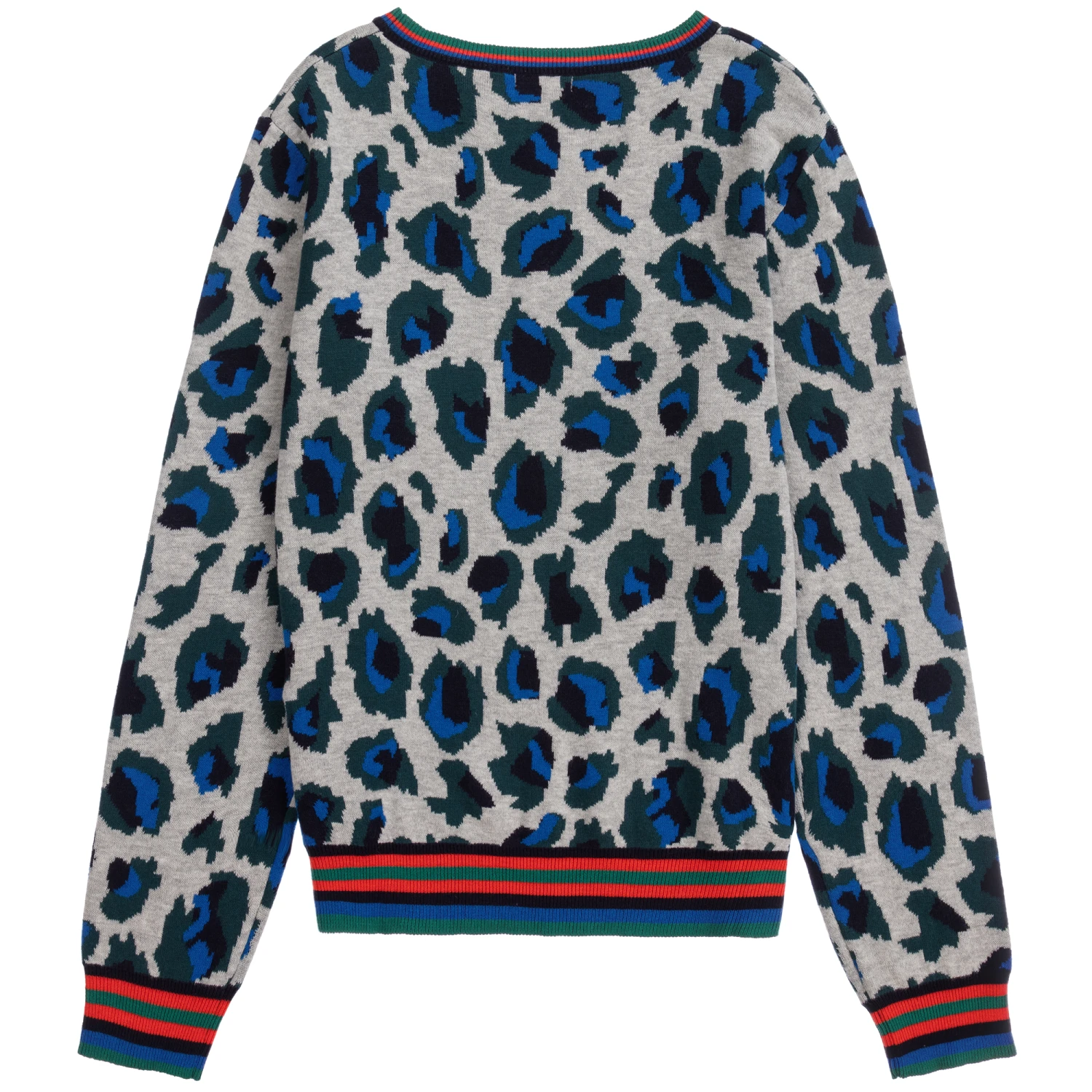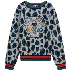 Unmistakably Kenzo Kids, this boys grey sweater has a green and blue panther pattern with iconic Tiger logo embroidery. Knitted in a double layer of cotton and viscose with a touch of wool, it has striped ribbed trims.