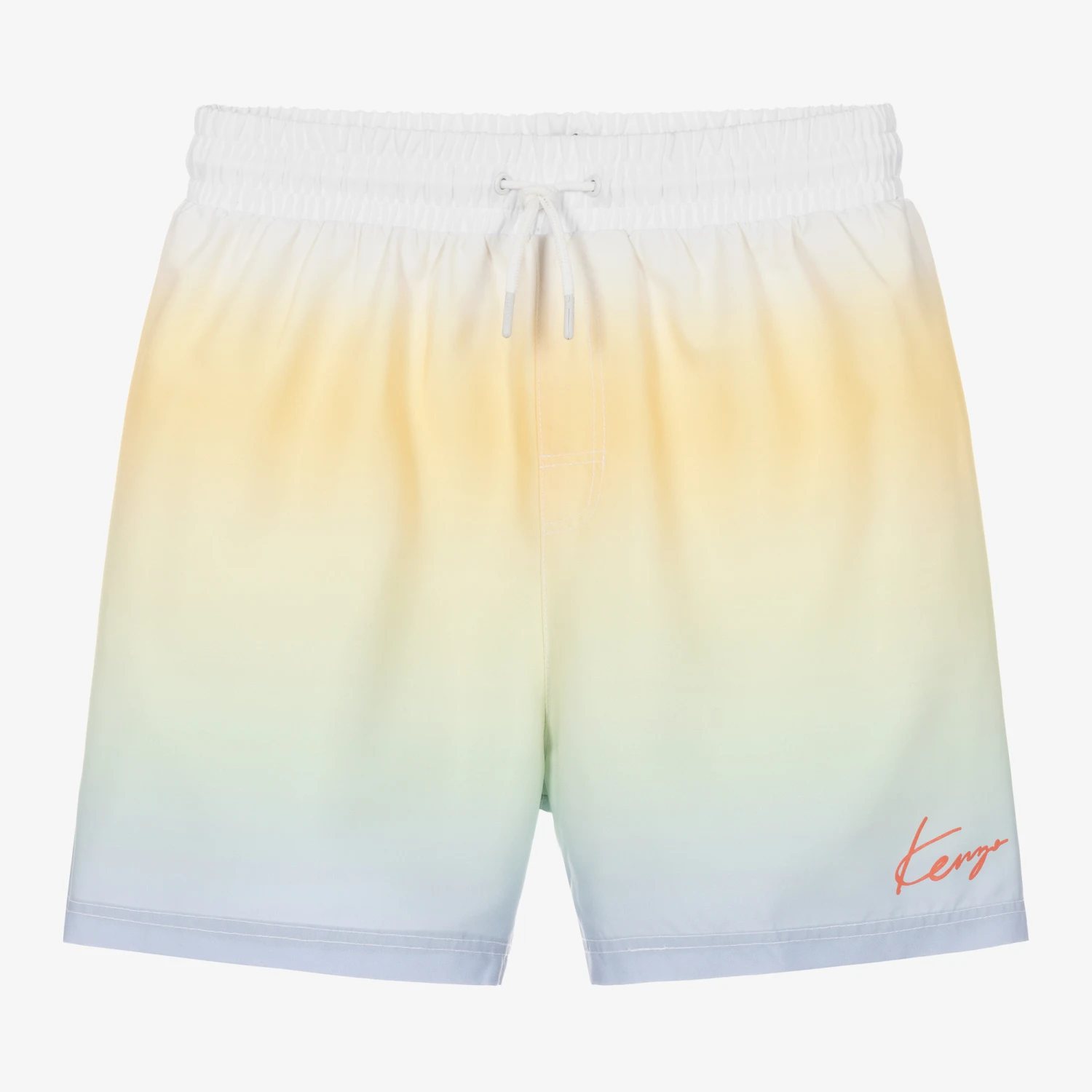 A pair of distinctive swim shorts for teen boys by KENZO KIDS, designed in a pastel yellow, green and blue colour gradient. Signed with an orange Kenzo script logo on the thigh, these stylish shorts have a full mesh lining for added comfort in the water. Branded drawstring ties on the elasticated waist allow for an adjustable fit.